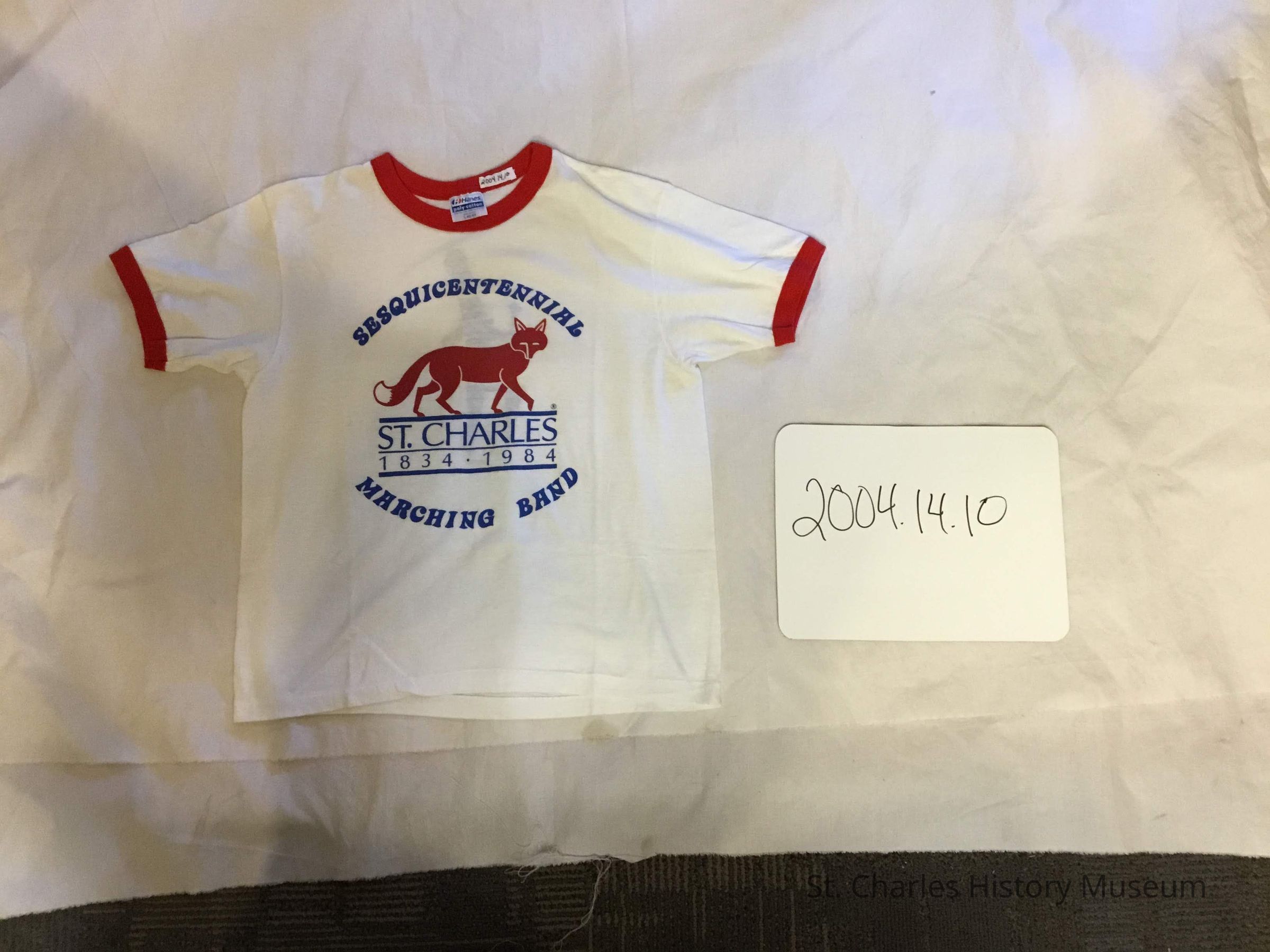 T-shirt St. Charles Sesquicentennial Marching band 1834-1984, white with red bancing around the sleeves and neck, features the Sesquicentennial logo.