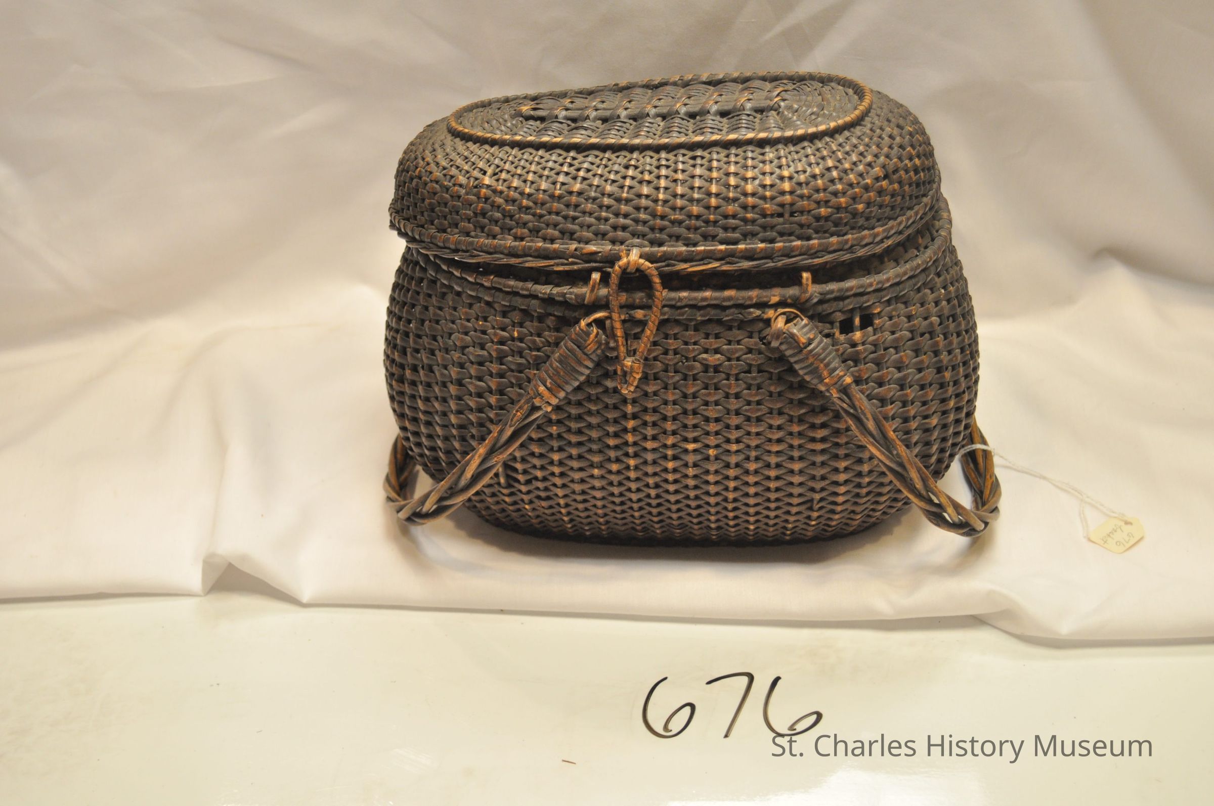 Work basket woven of dark reed flat bottom, oval shaped, handles attached lid broken off. Belonged to Grandma DumperLexicon