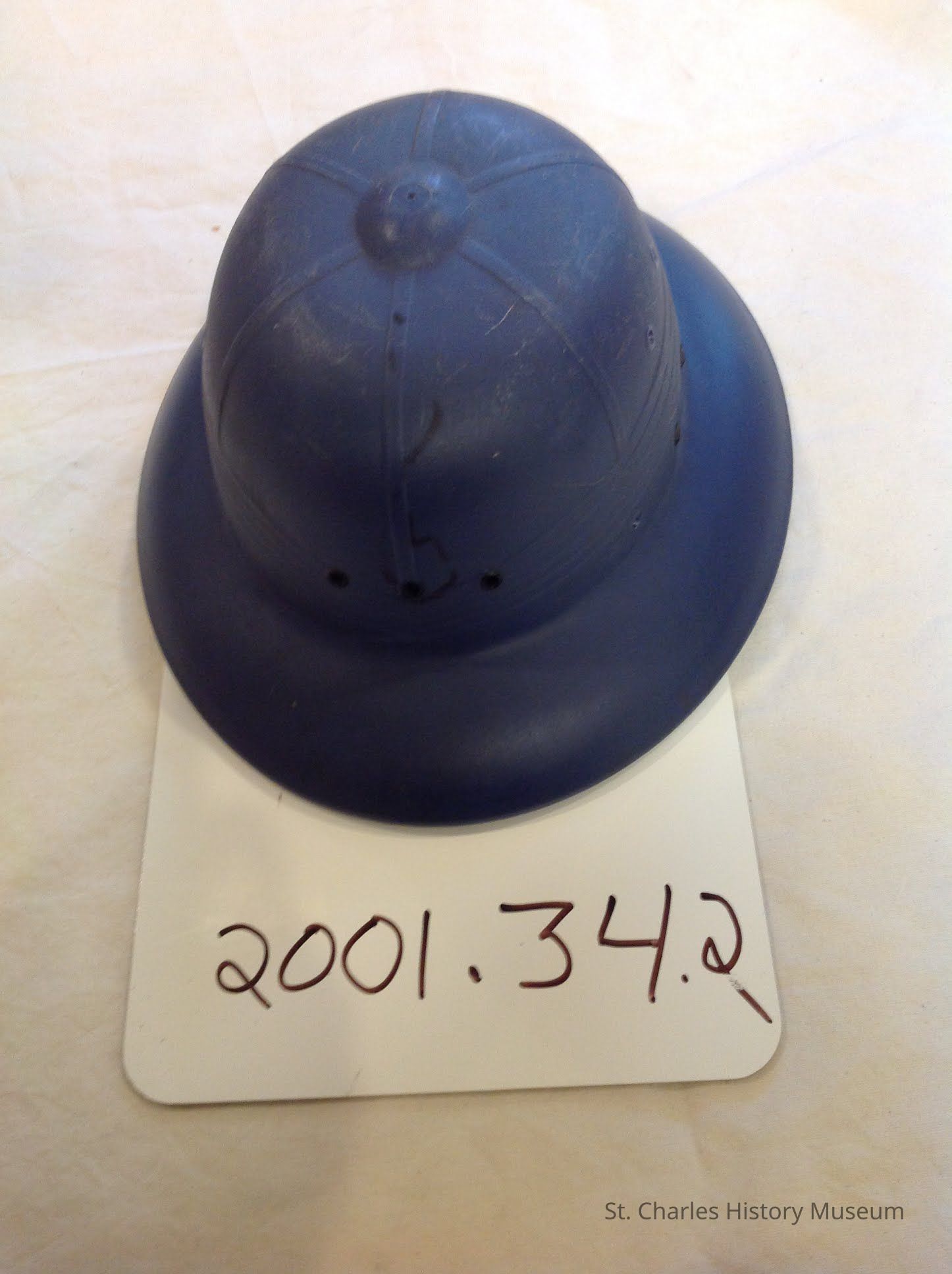 Blue pith helmet worn by employees of the St. Charles Post Office.Lexicon