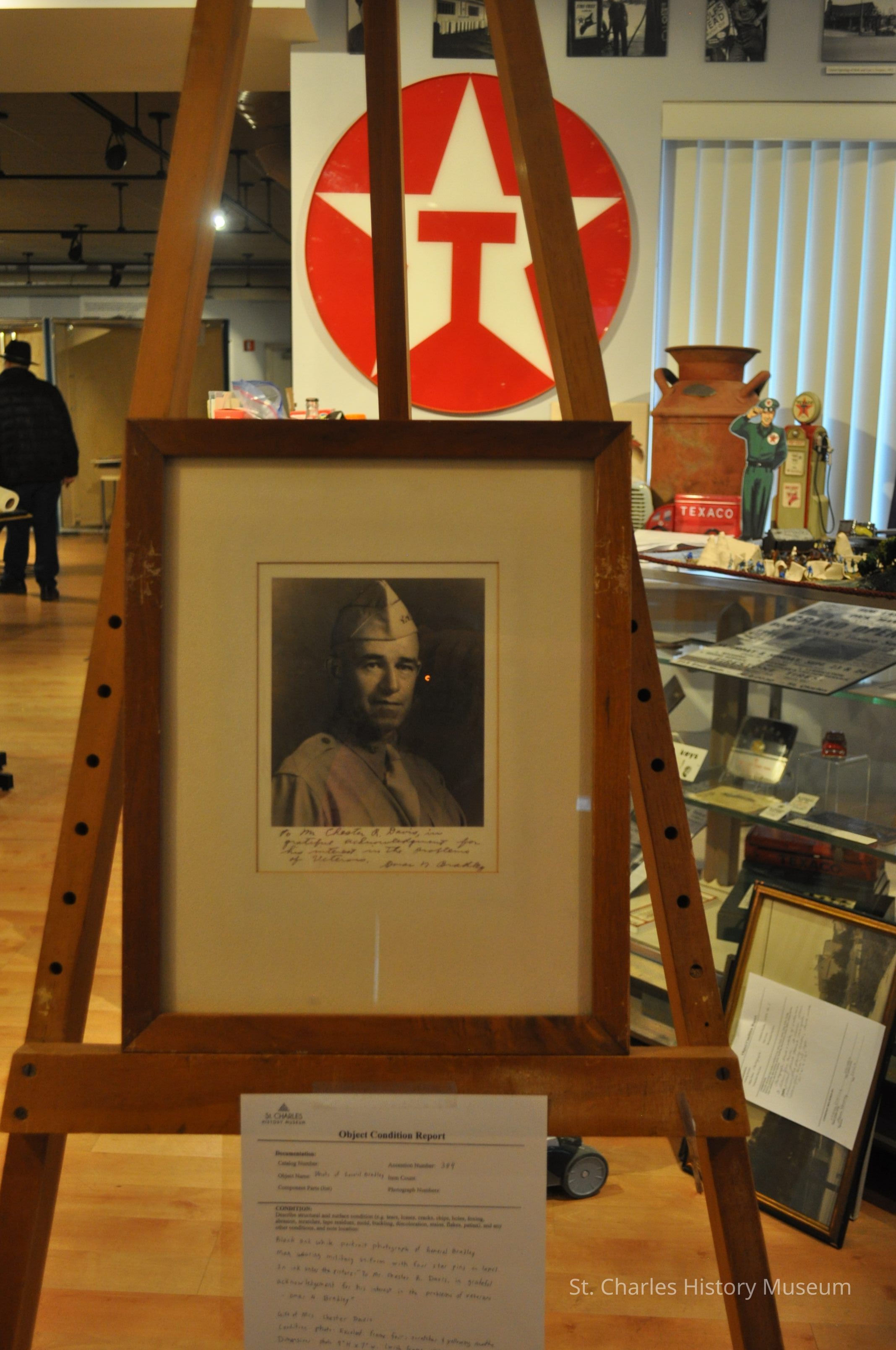 Framed black and white photograph of General Bradley. In ink under the picture, "To Mr. Chester R. Davis, in grateful acknowledgement for his interest in the Problems of Veterans. Omar N. Bradley"