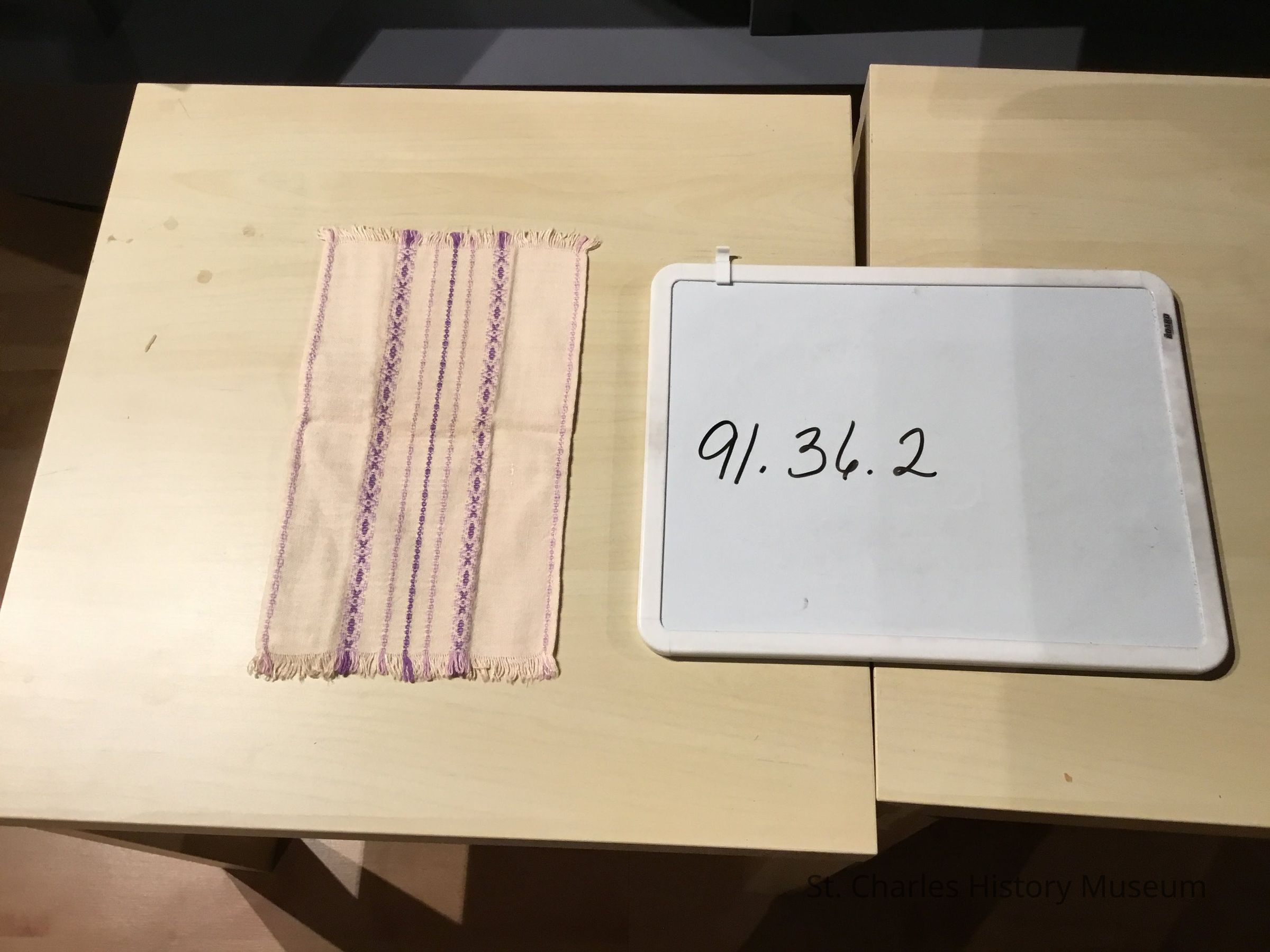 Light pink cotton cloth with fingered ends. One row of light pink embroidery down each side. Center row of light, medium, and dark pink embroidery. A row of light pink on each side of center.Lexicon