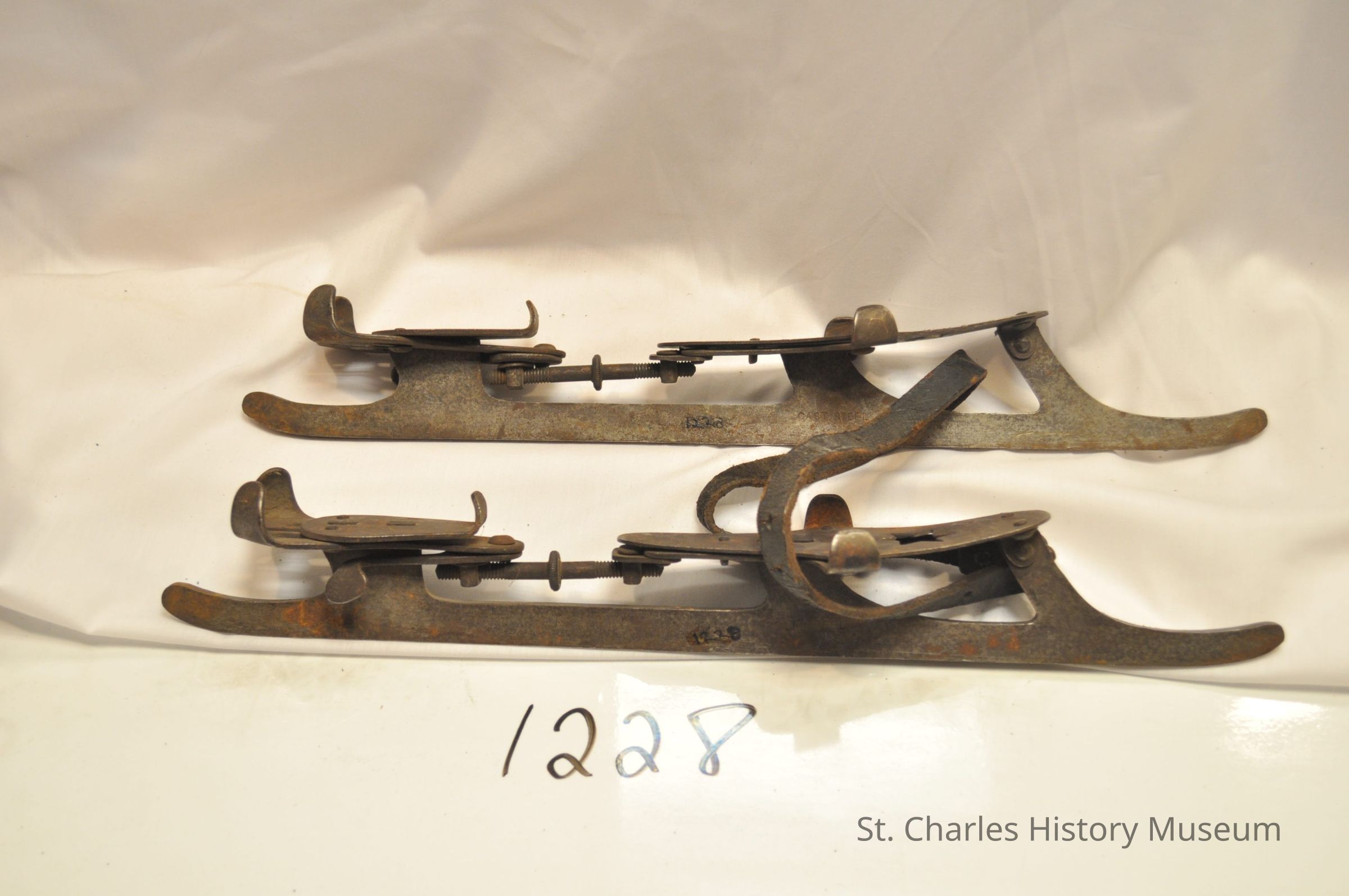 Early racing skates. Metal, fit on shoe. "U.S. Racer" size 10 1/2. 16" l. "Star" cut out on top part of skate. Some corrosion. Given by Elbert Peterson in June, 1975.Lexicon