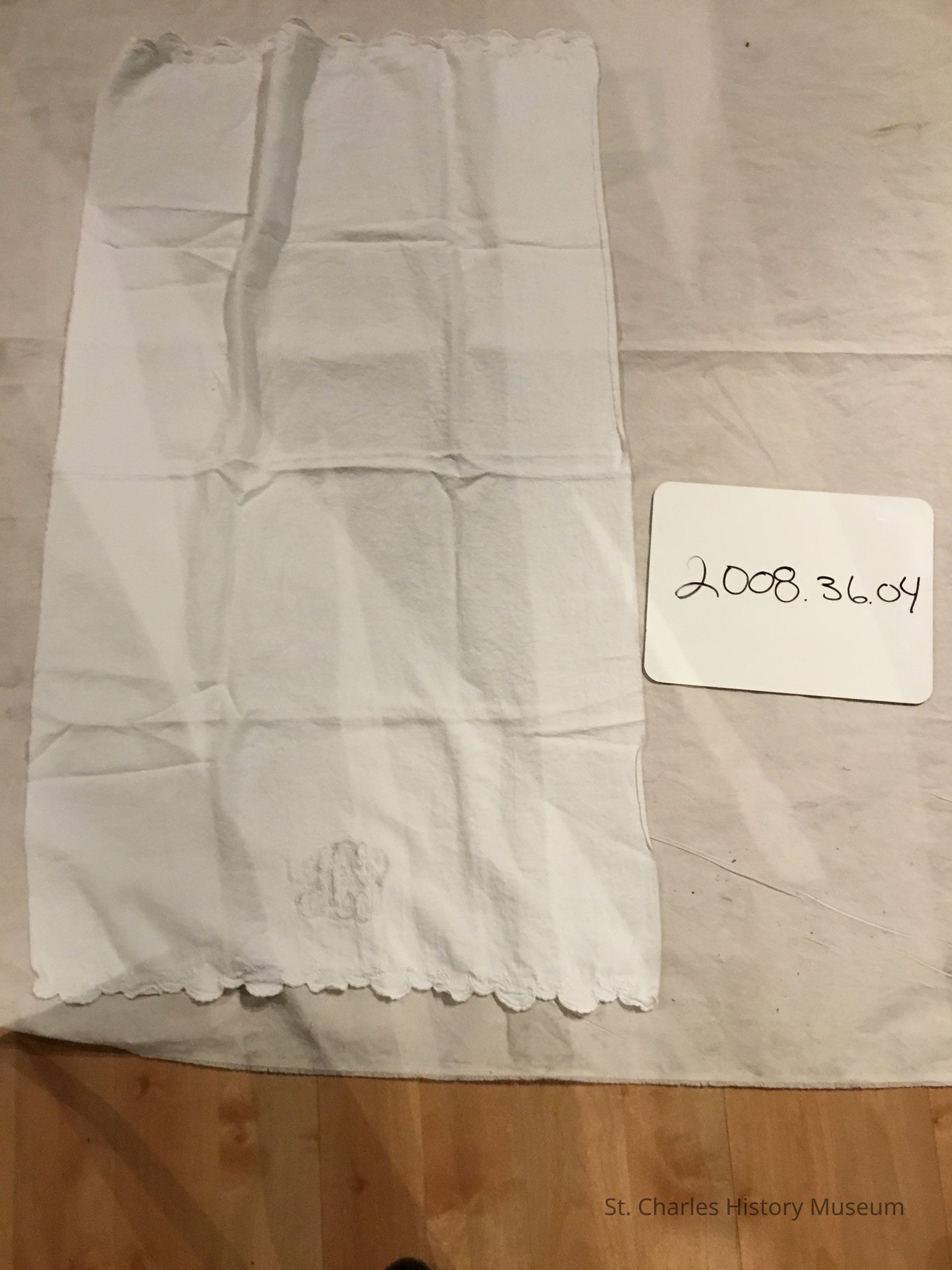 One large linen antimacassar thought to be embroidered with JWG the initials of John Warne Gates, initials are hard to decipher. Donor purchased these at the estate sale of the Norris Family at the home on North Fifth Avenue after Lester Norris passed away.Lexicon