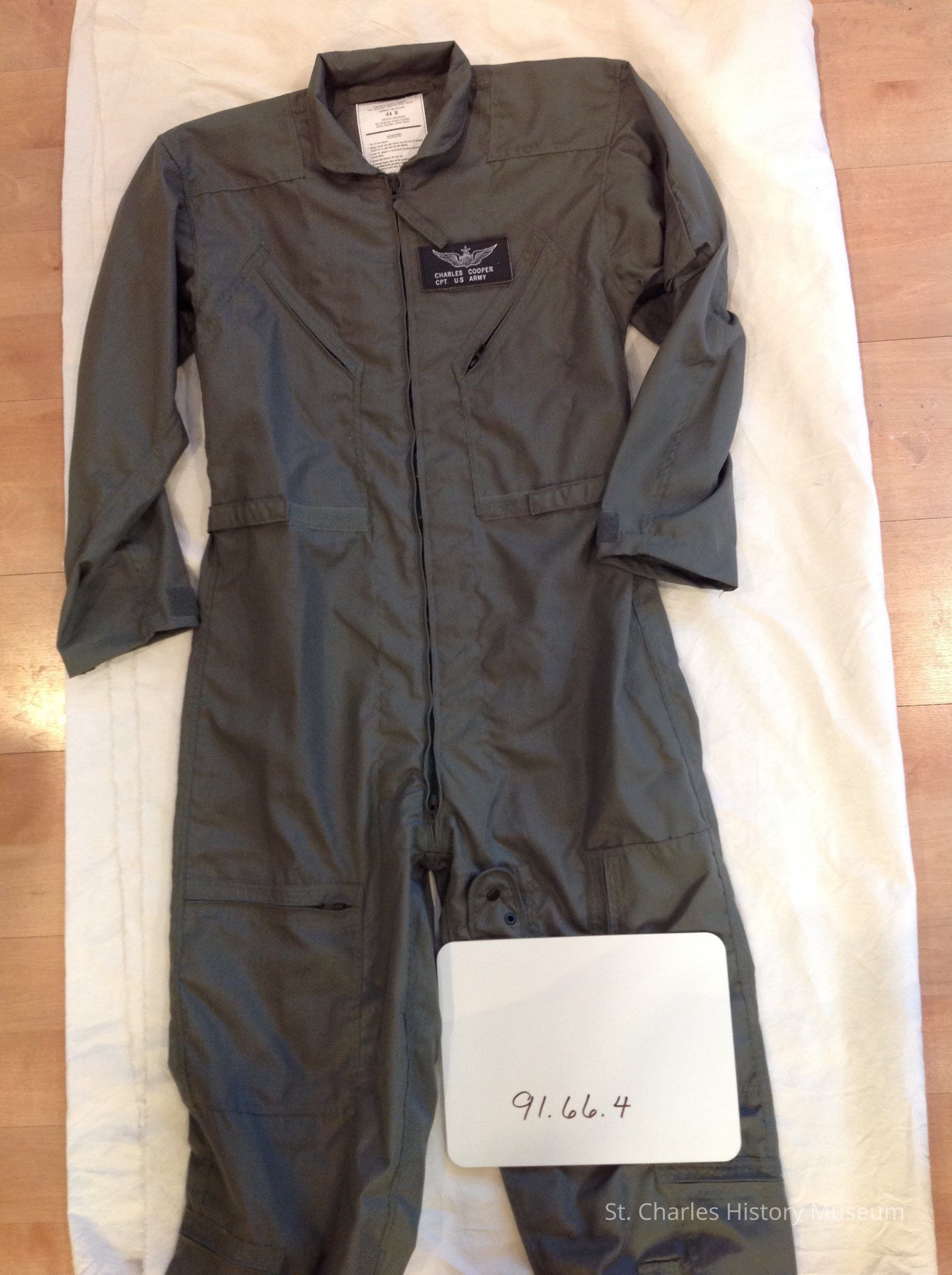 Flight suit. Dark green flyers summer coveralls. Size 44R. Long sleeved suit zips up front of garment. Zipped pockets and velcro on the sleeves. Belonged to Chuck Cooper.Created By
