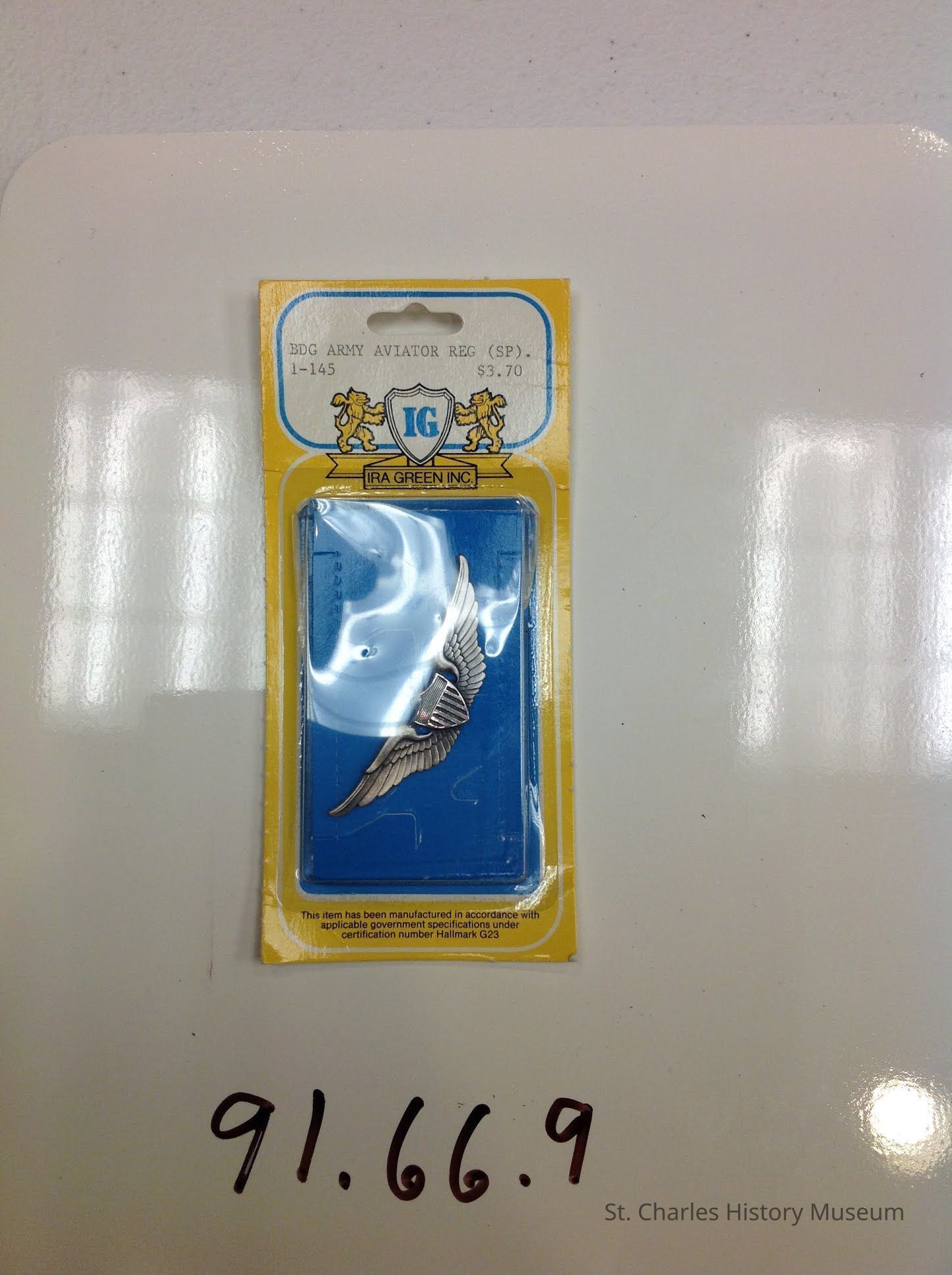 Unopened package of an Army Aviator Pin. 1-125. Yellow and blue box contains 1 metal oin. Wings with shield in center. Among Chuck Cooper's possessions when he died Feb. 1991 during persian Gulf War.Created By