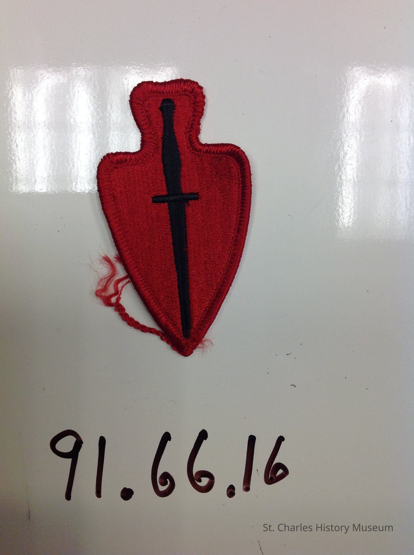 Sewn, fabric patch. Shaped like an arrowhead. Red patch with a black sword in the center. Is a 1st Army- United States Army Special Operations Command patch. Red patch is worn on the dress uniform.Lexicon