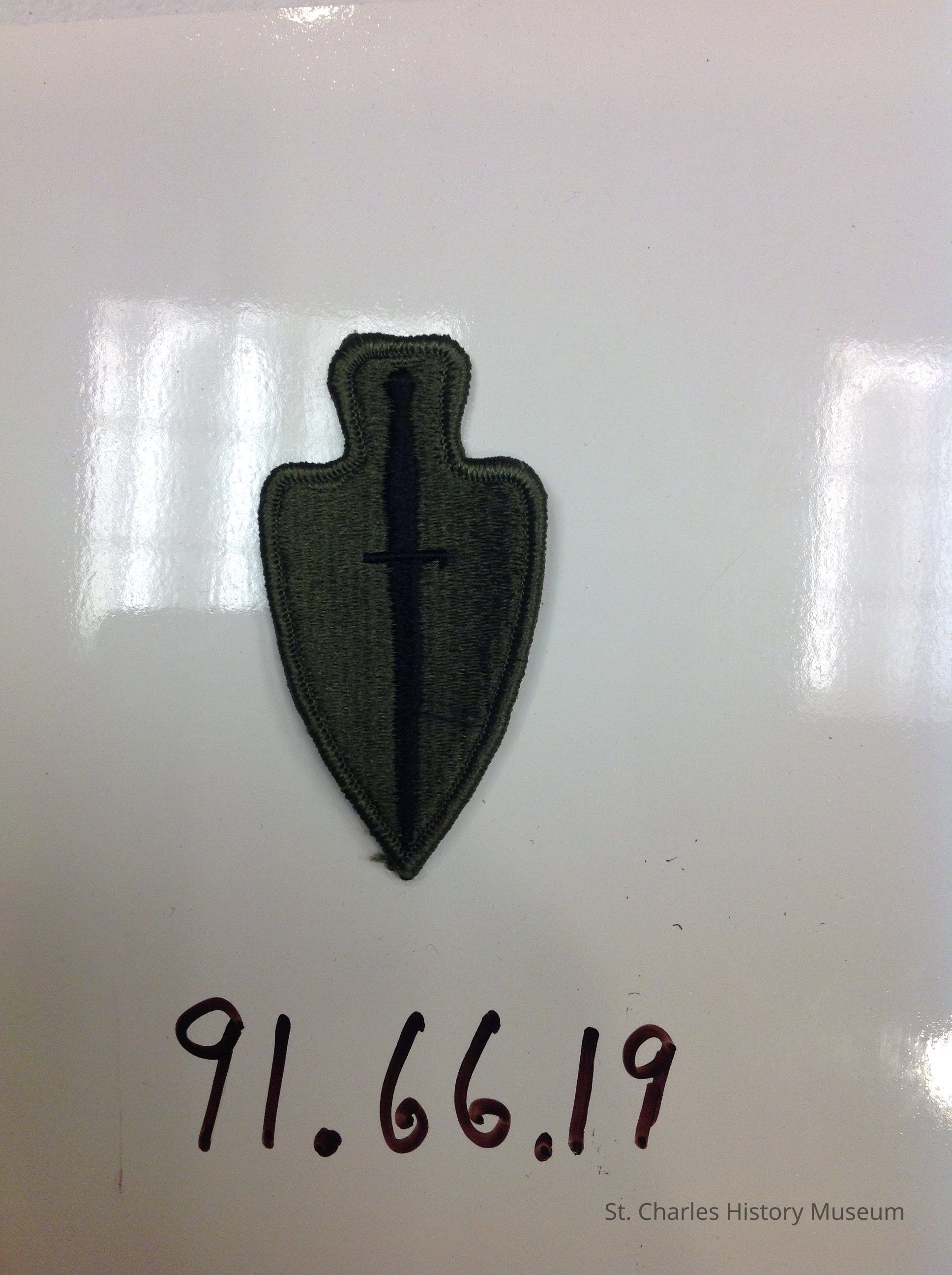 Sewn fabric patch. Shaped like an arrowhead. Dark green patch with a black sword through center. Is a 1st army United States Army Special Operations command Patch. Is worn on battle uniform.Lexicon