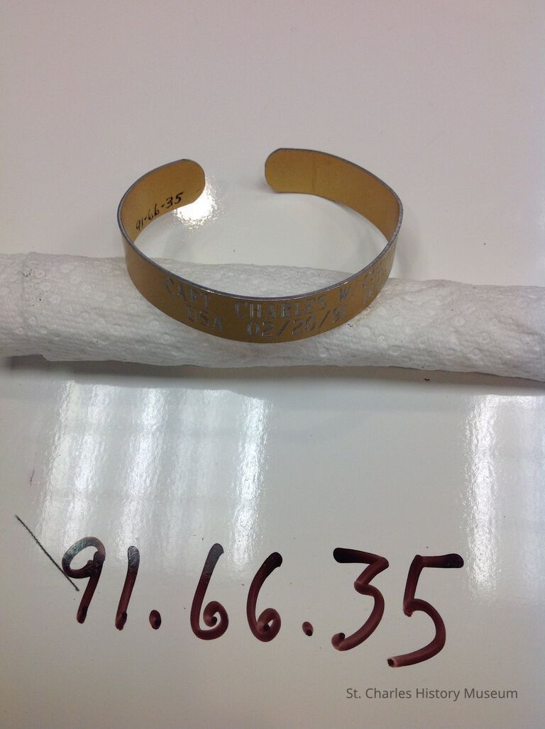 Gold painted tin bracelet. Incribed in bracelet is "Capt. Charles W. Cooper, USA, 02/20/91 IRAQ." Real date of death was 2.21.91. Diestributed at memorial service in Kentucky, Memorial Day, 1991.Lexicon