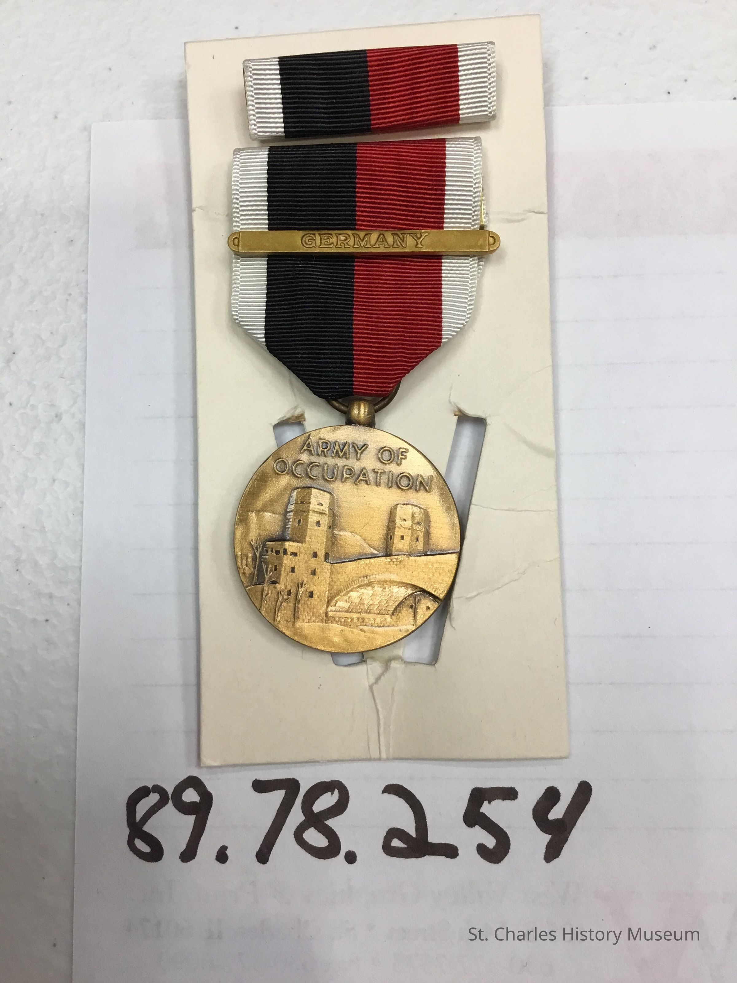 (c) Description. The medal is Bronze, 11/4 inches in width. On the obverse, the Remagen Bridge abutments below the words “ARMY OF OCCUPATION”. On the reverse, Fujiyama with a low hanging cloud over two Japanese junks above a wave scroll and the date “1945”. A Bronze clasp 1/8 inch wide and 11/2 inches in length with the word “GERMANY” or “JAPAN” is worn on the suspension ribbon to indicate service in Europe or the Far East. NAVY: On the obverse is Neptune mounted on a composite creature of a charging horse and a sea serpent with a trident grasped in right hand above wave scrolls. Around the bottom of the medal are the words “OCCUPATION SERVICE”. The reverse is the same as the China Service Medal and is an eagle perched on the shank of a horizontal anchor with a branch of laurel entwined around the anchor. On the left is the word “FOR” and to the right is the word “SERVICE” and around the top is the inscription “UNITED STATES NAVY”. MARINE CORPS: The medal for the Marine Corps is the same as the Navy, except the inscription around the top of the reverse is “UNITED STATES MARINE CORPS”. The ribbon is the same for both medals and is 13/8 inches wide and consists of the following stripes: 3/16 inch White 67101; 1/2 inch Black 67138; 1/2 inch Scarlet 67111; and 3/16 inch White.Collection