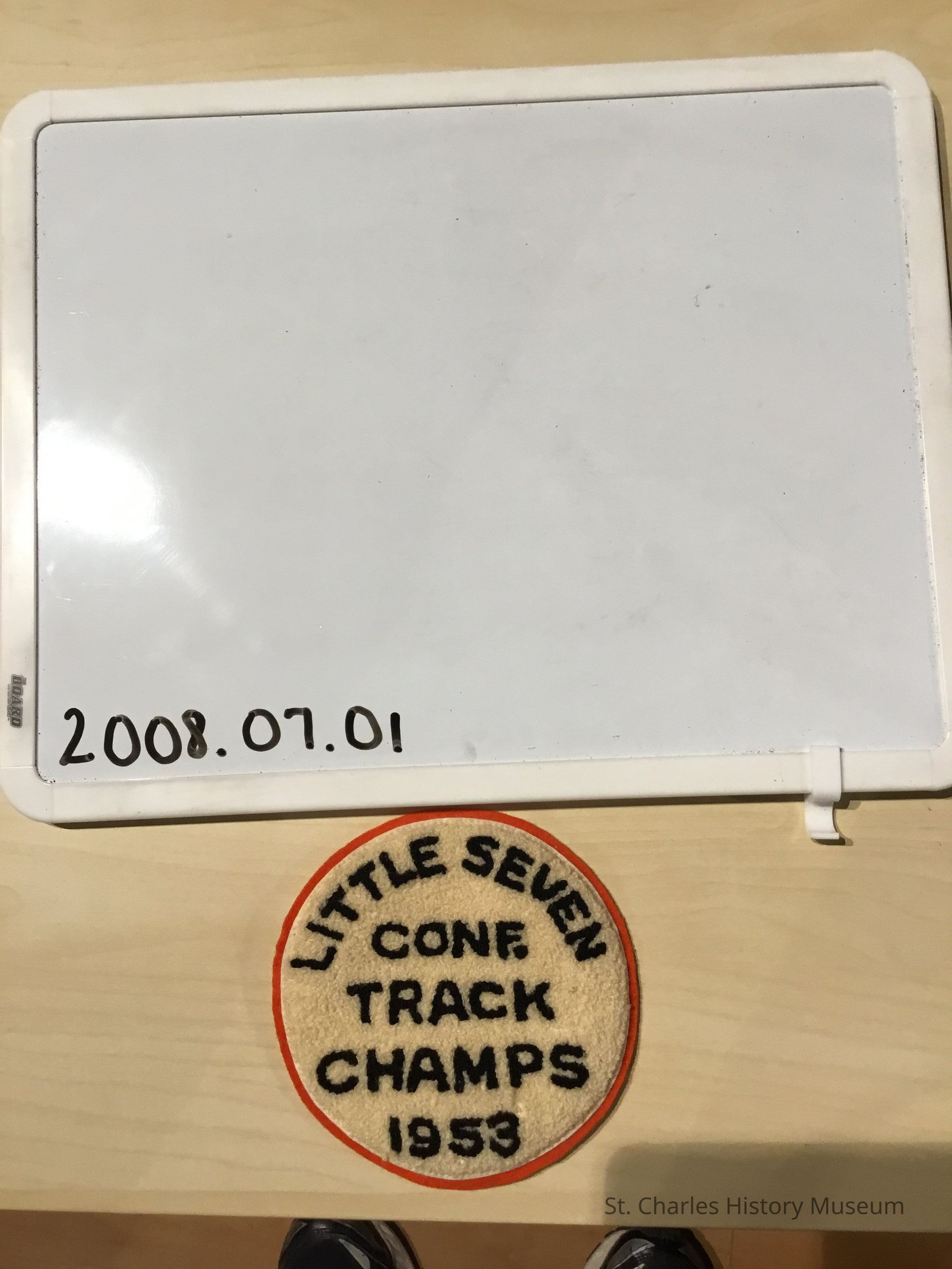 Large round patch awarded to donor for being part of the team that won the "Little Seven Conference Track Champs of 1953". Patch is white with an orange background and black lettering.Created By