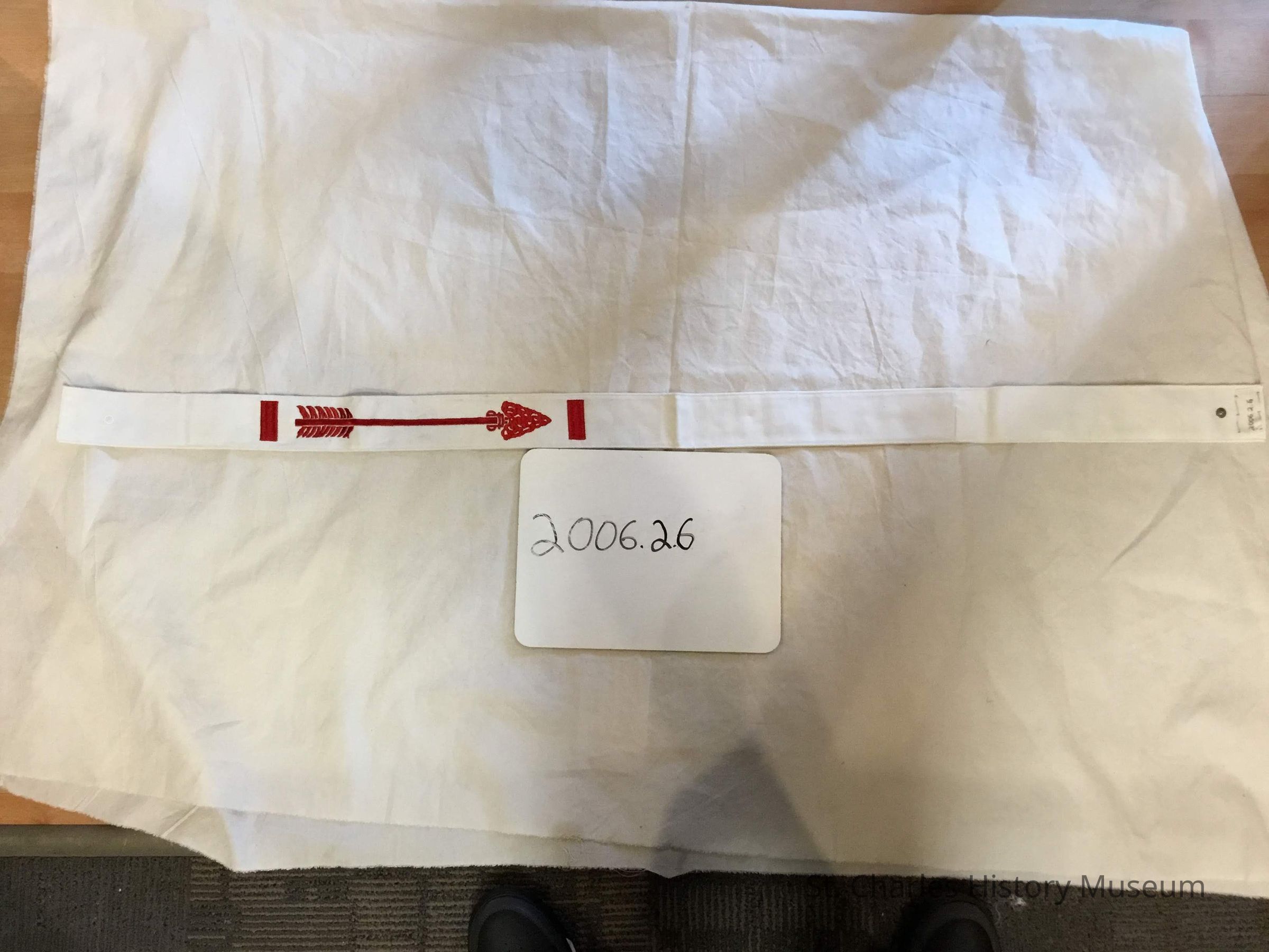White cotton sash with a red arrow for the order of the arrow, also has red lines embroidered at the beginning and end of the arrow.Lexicon