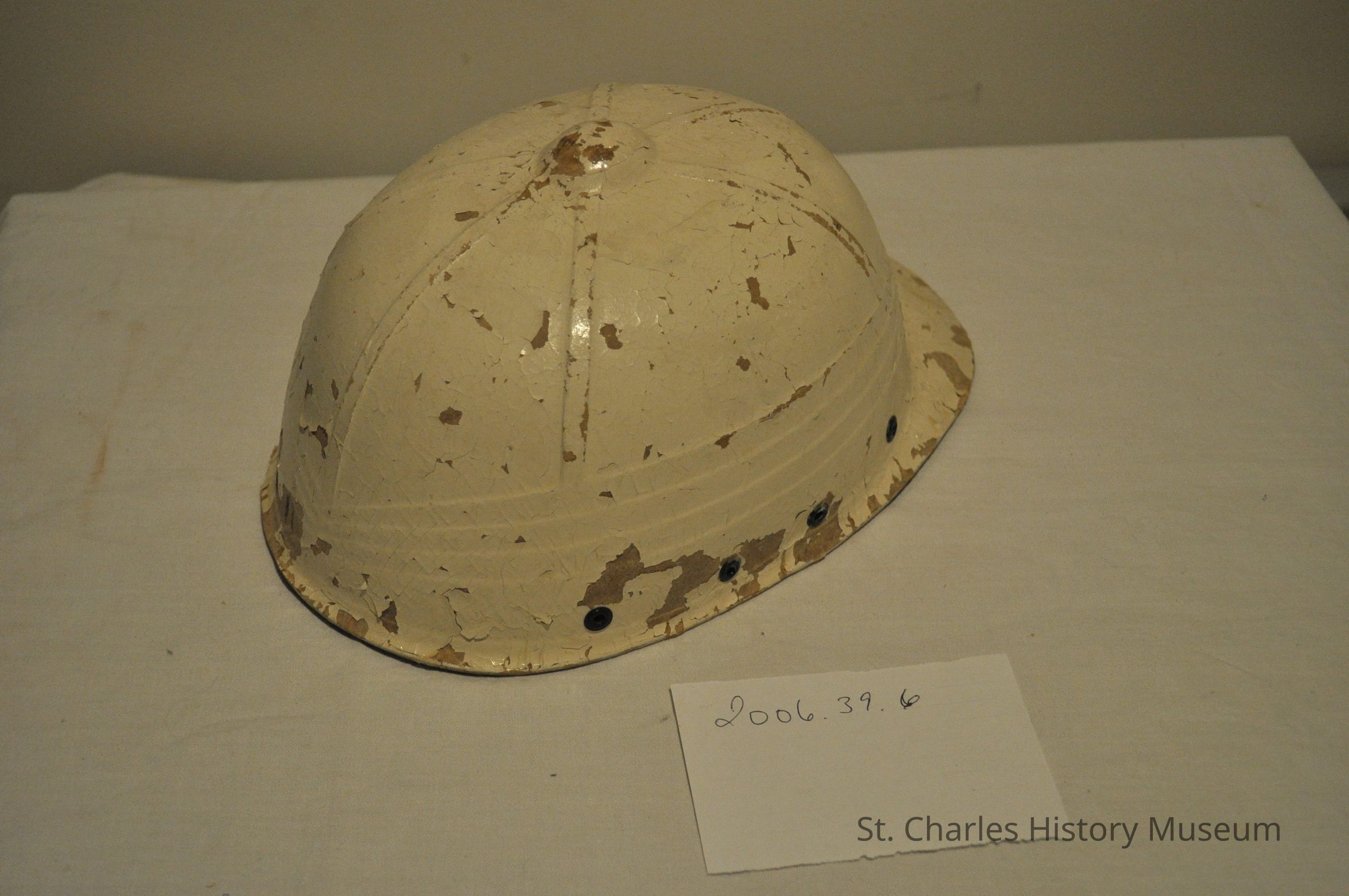 Protype hat manufactured by Hawley Products. The hat is made from the pith helmet shape and modified to cut off the brim. The company employed the donor's husband for numerous years.Lexicon