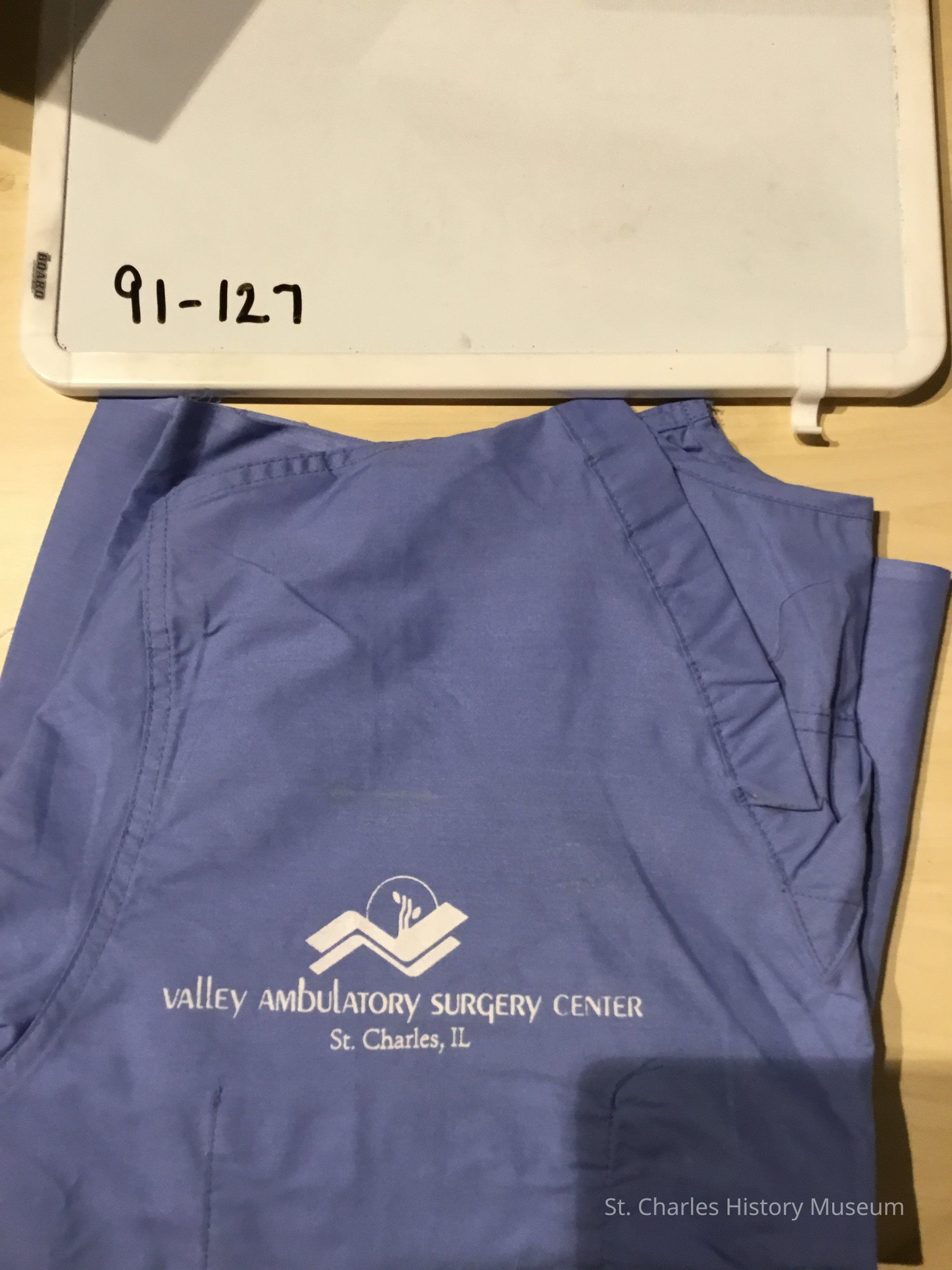 Light blue cotton blend shirt V-neck. Short sleeves. Pocket on front of shirt. One on inside and one on outside. Stamped in white, "Valley Ambulatory Surgery Center, St Charles, IL." collected by staff member who had foot surgery. Condition: few stains on front and collar.Lexicon