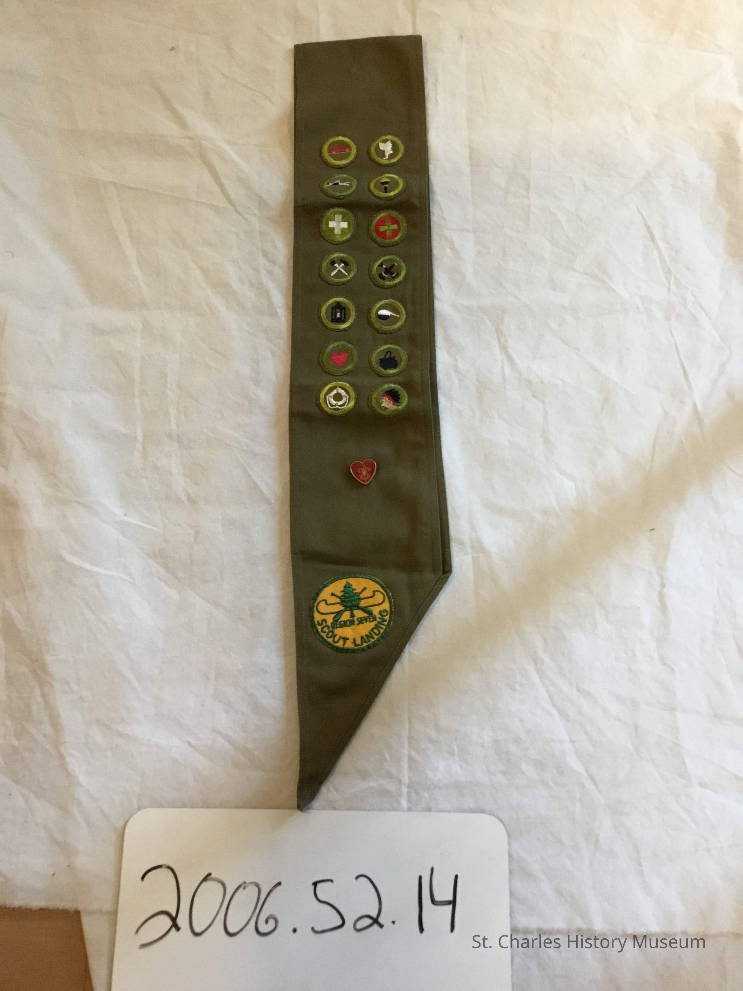 Olive green sash that belonged to Willard Kautz when he was a Boy Scout, has fifteen patches and one pin for the Boy Scouts of America.Lexicon
