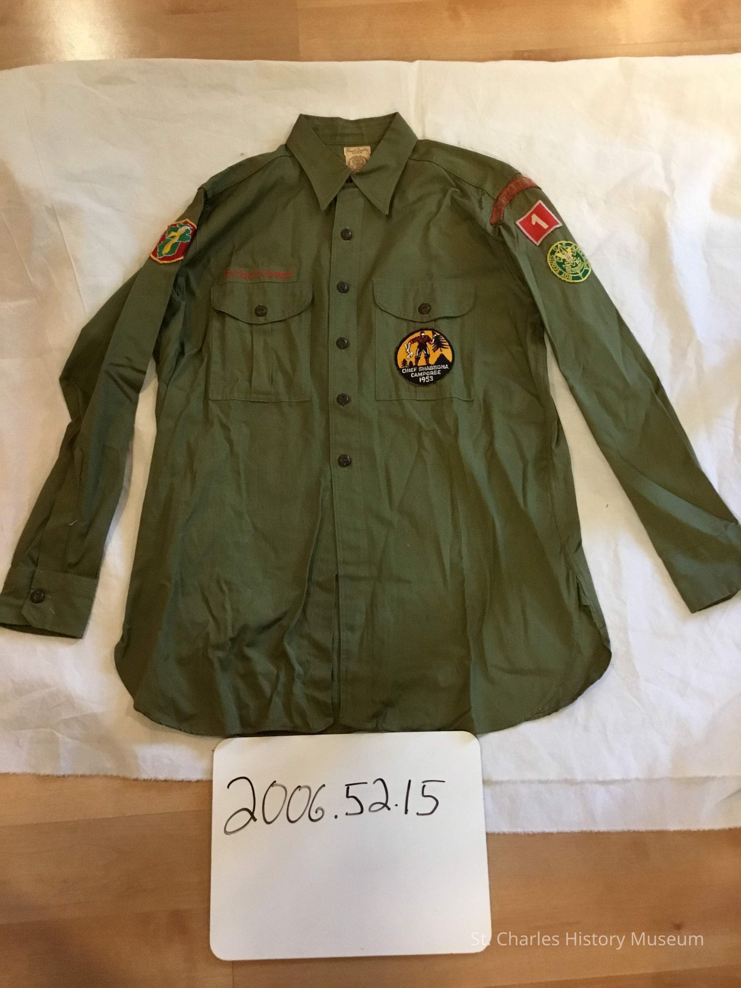 Olive green long sleeved shirt worn by Willard Kautz when he was active in the Boy Scouts in St. Charles Troop #1. Patches on the shirt include the Chief Shabbona Camporee of 1953.
