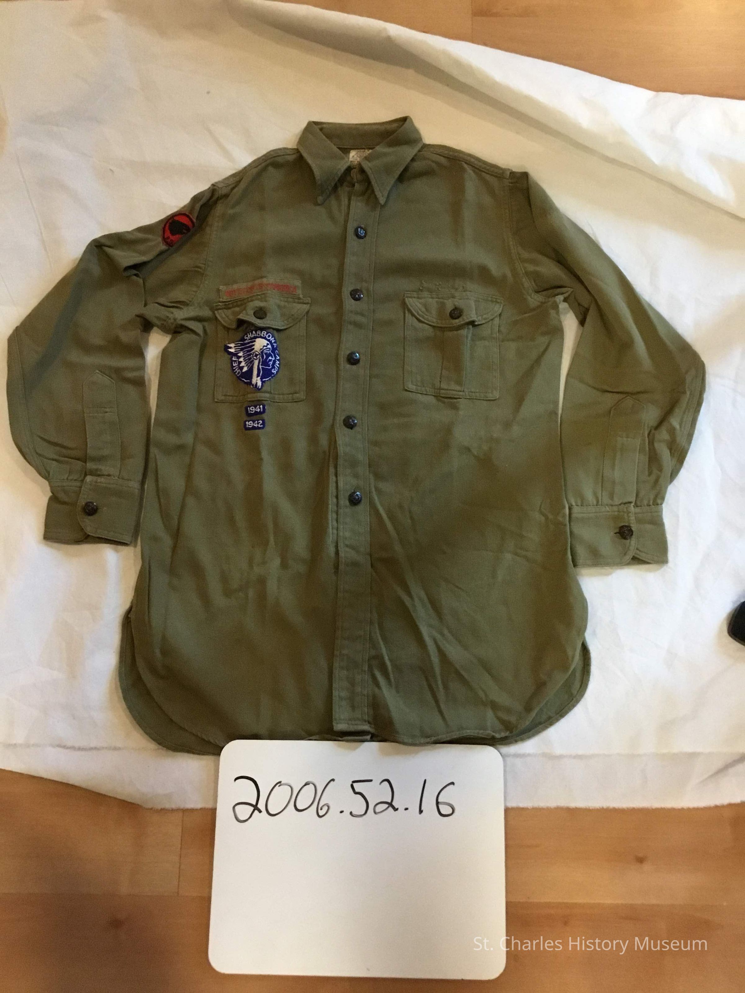 Olive green long sleeved shirt worn by Willard Kautz when he was active in the Boy Scouts. Patches on the shirt include the Chief Shabbona Camps and dated 1941 and 1942.