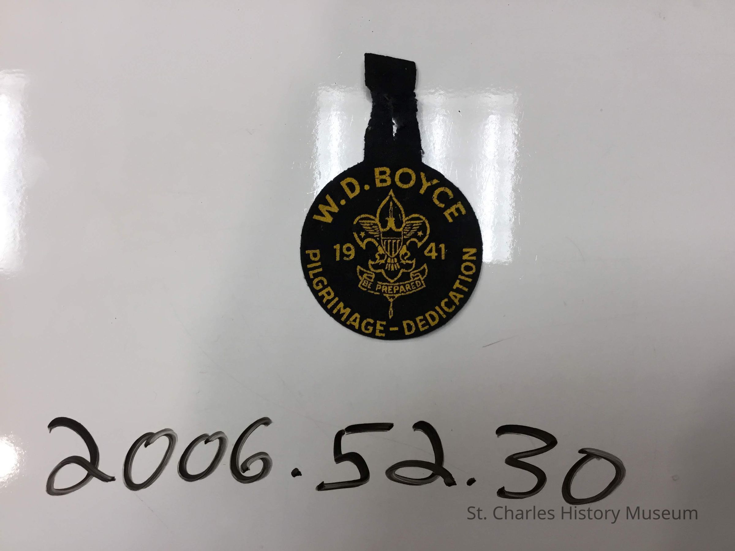 Round patch with "W.D. Boyce 1941 Pilgrimage-Dedication" printed on it.