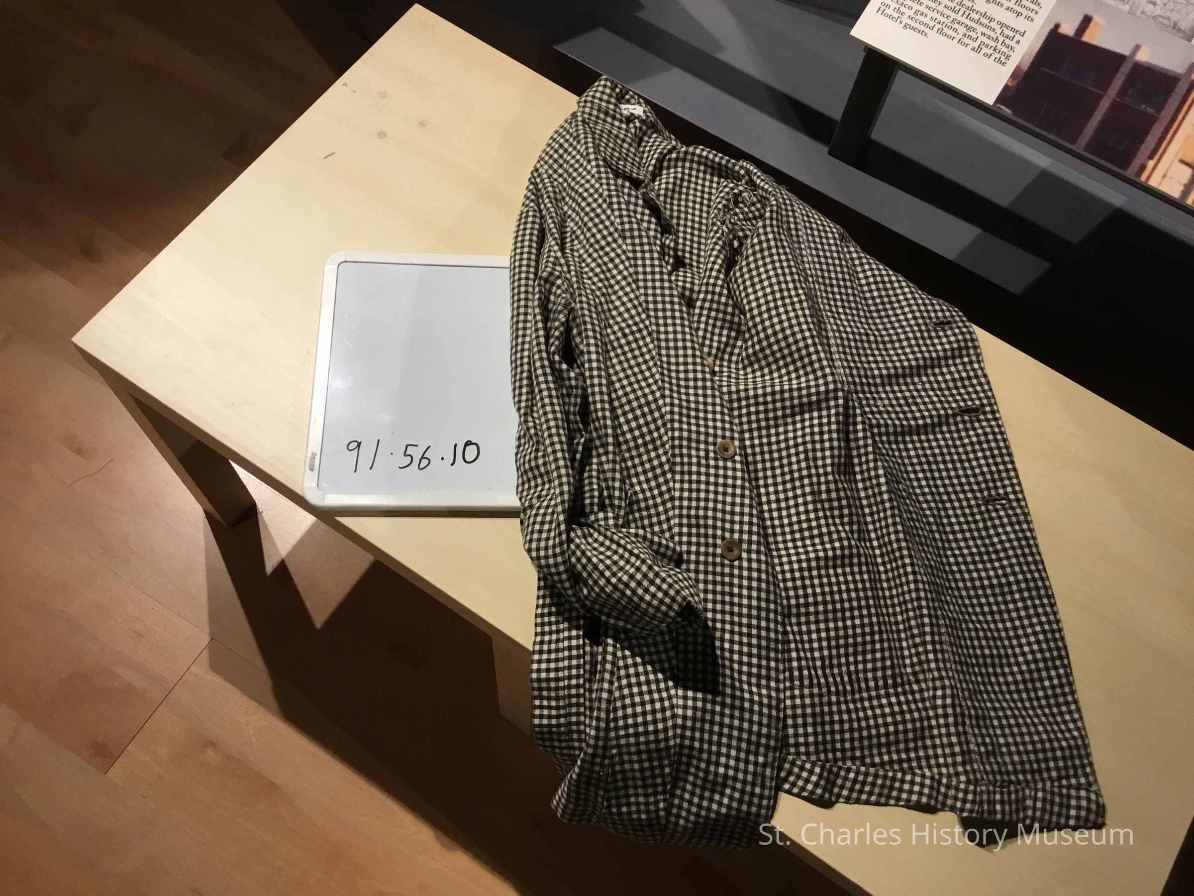 Black and white check cotton bland jacket. Long sleeves. 2 pockets on front of jacket. 4 brown buttons down front. Belt with button closure. Condition: stitches under right arm loose. Fabric worn on pockets.Lexicon
