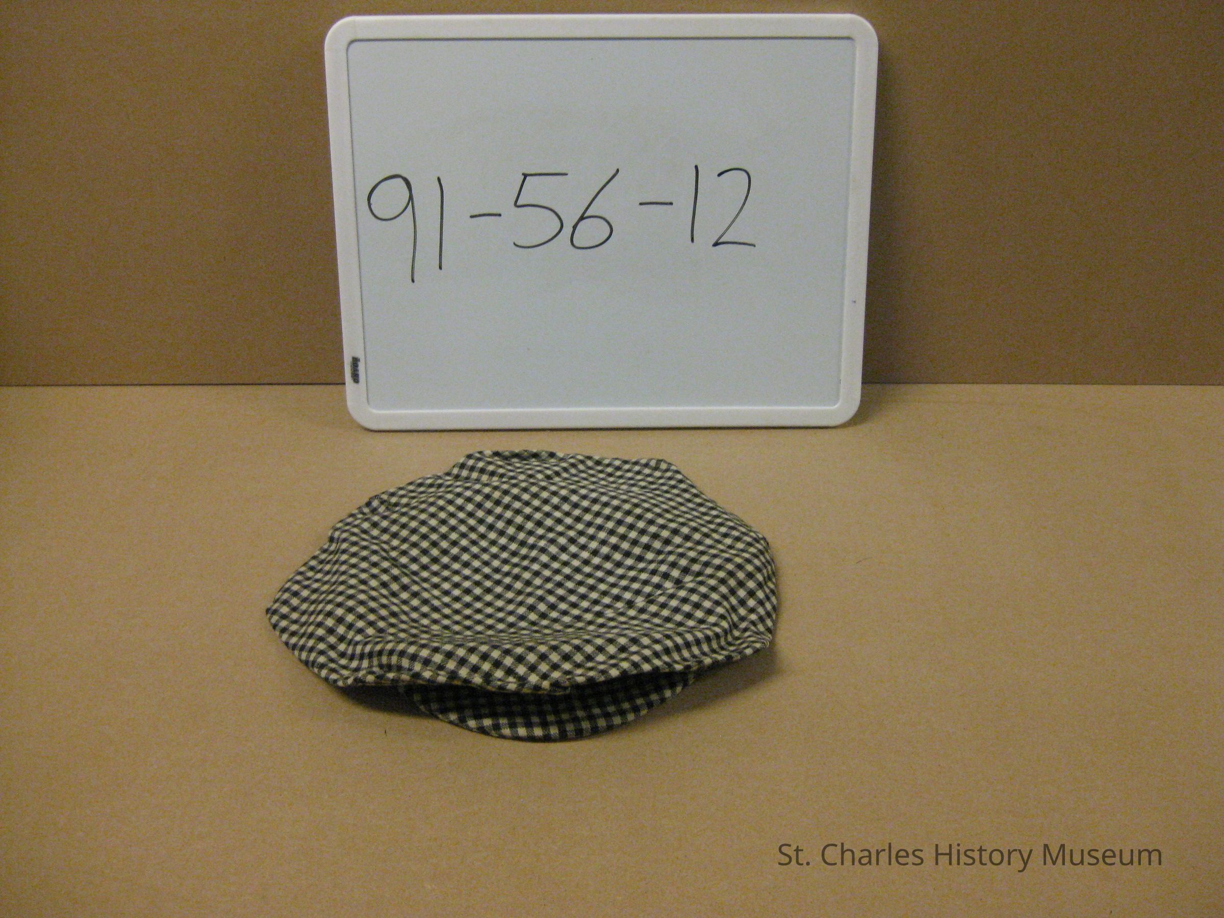 Cap. Black and white check, cotton blend fabric. Gray lining. bell on cap. Condition: lining has shattered, some discoloration.Lexicon