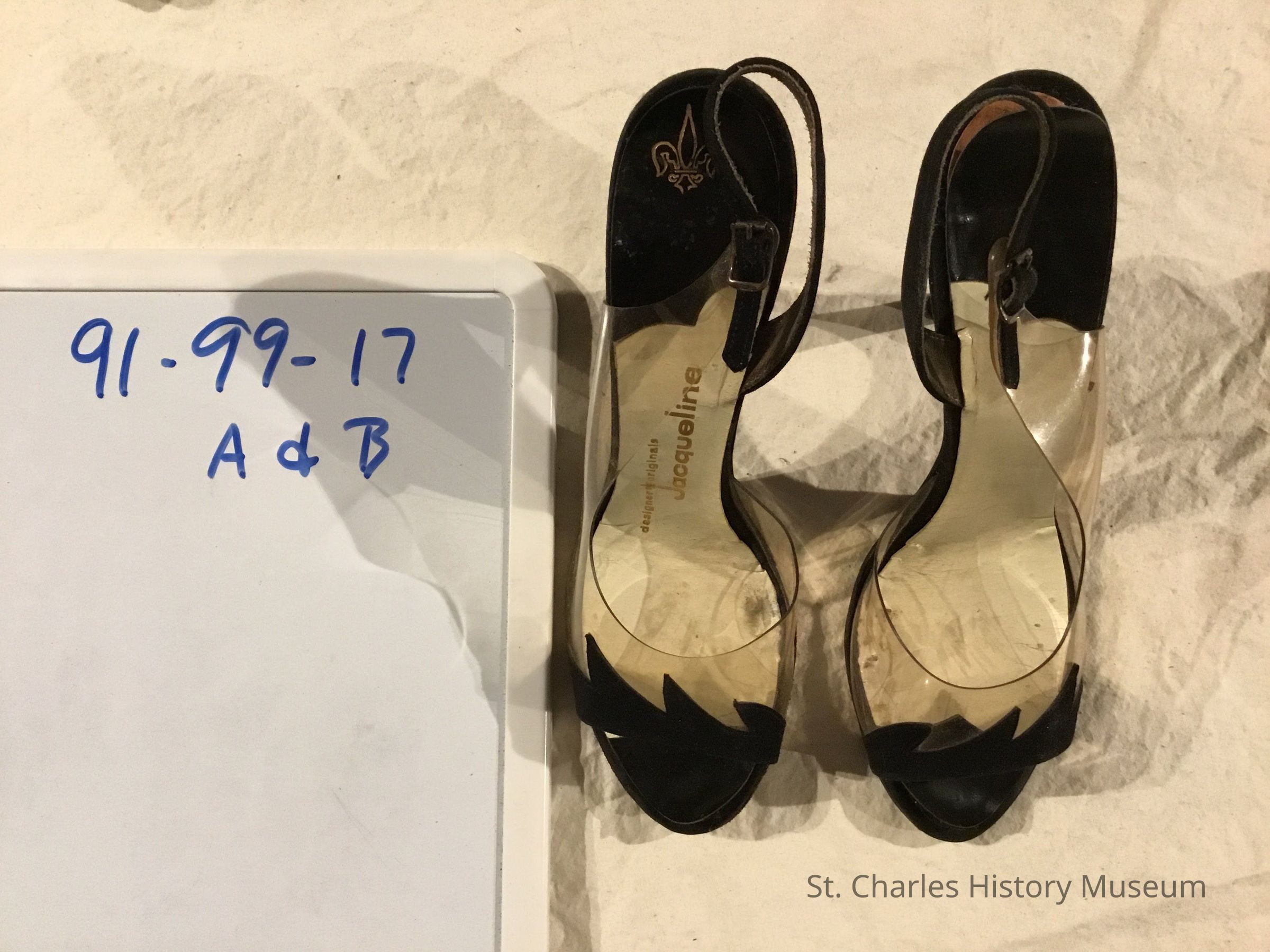 Shoes belonging to Mary Catherine Howard, St. Charles. Worked in Chicago in 50's and 60's. 2 1/2 inch spiked heel. Black felt heel. Heel strap, open toe, clear plastic up side of foot. Black felt design on plastic. "Jacqueline" shoes. Right shoe. Condition: paper lining of shoe peeling.Dimensions
