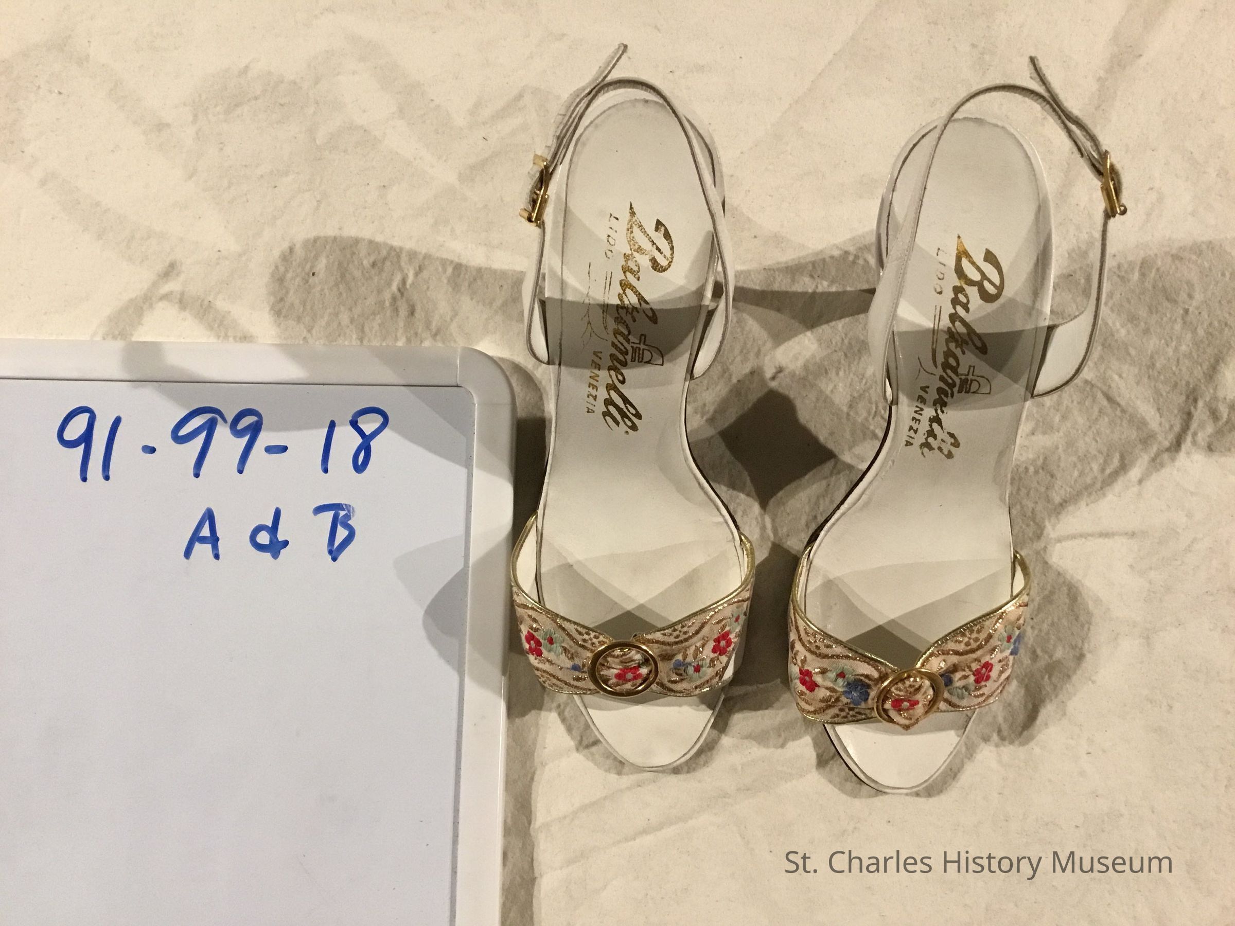 Shoes belonging to Mary Catherine Howard, St. Charles. Worked in Chicago in 50's and 60's. 2 1/2 inch spiked heel. Black felt heel. Heel strap, open toe, clear plastic up side of foot. Black felt design on plastic. "Jacqueline" shoes. Left shoe. Condition: paper lining of shoe peeling.Dimensions