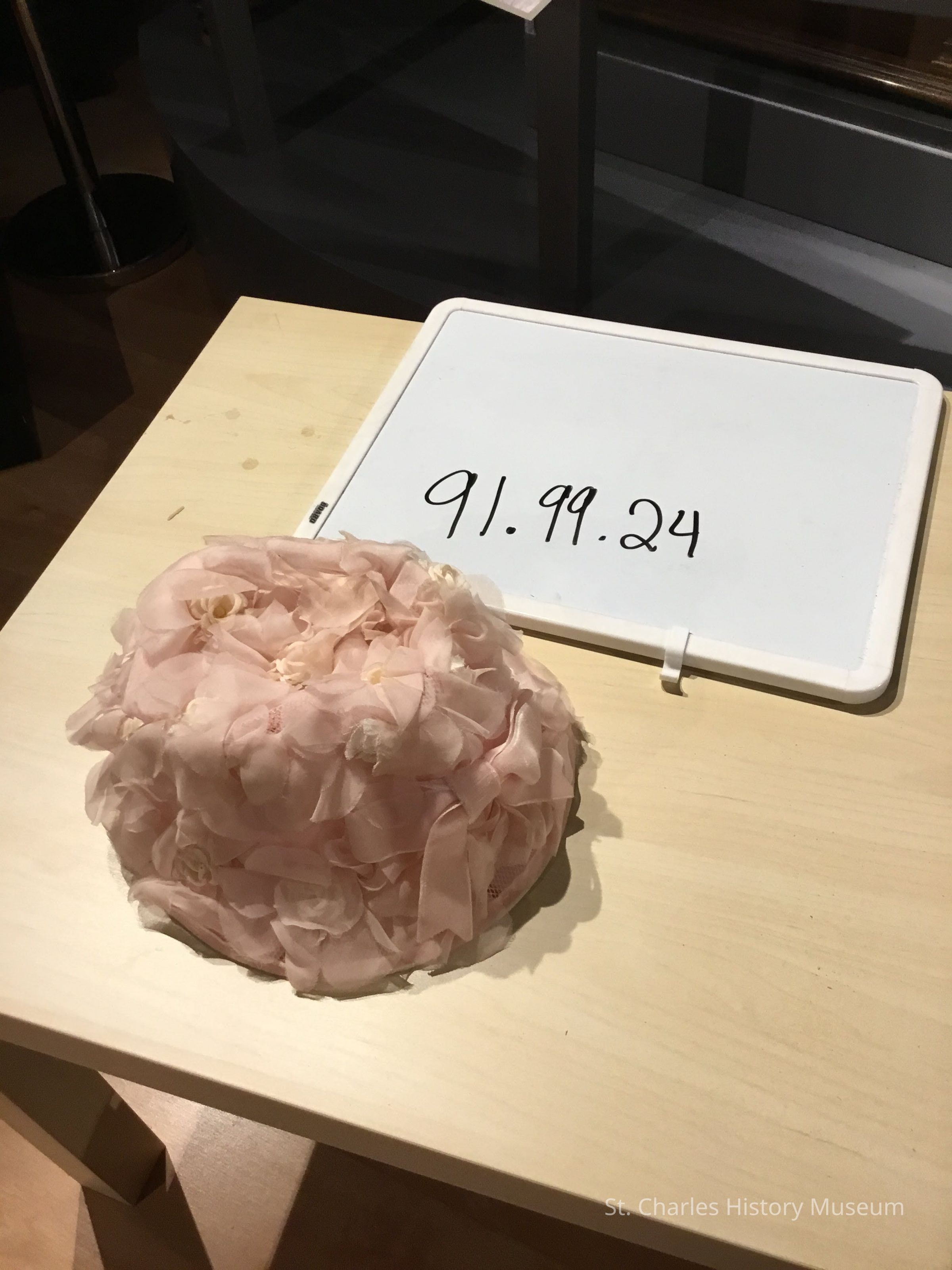 Hat. Stiff pink framework. Pink voile flower petals attached all over hat, with pink fabric roses in center of petal. Worn by Mary Catherine Howard as an Easter Hat, 1960's. Stored in a faded pink, square box.Lexicon