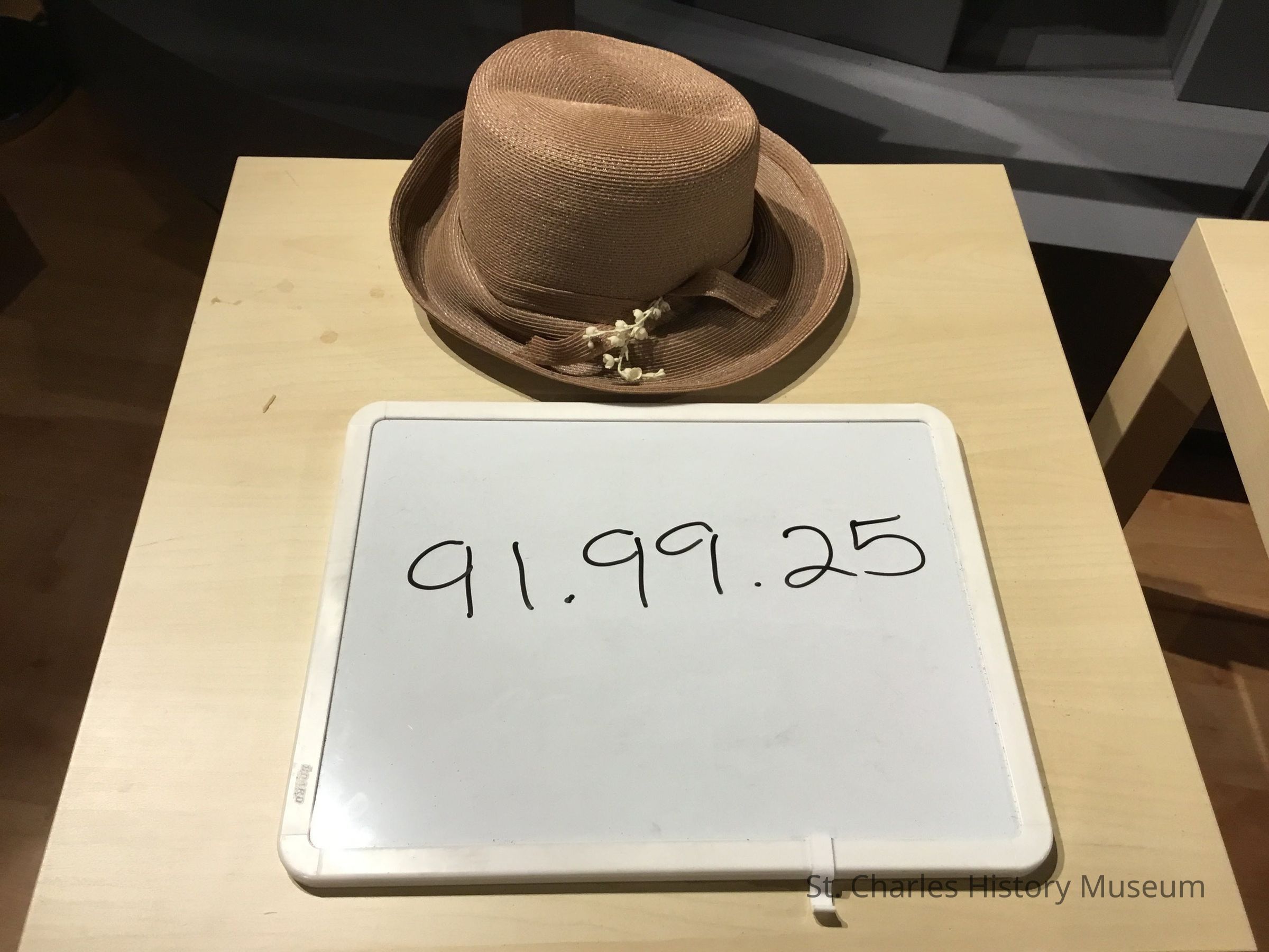 Light brown straw hat. Narrow brim at back of hat turns up and brim lays flat in front. High Crown. Ribbon around crown with artificial Lily of the Valley flowers in bank. Marshall Field and Company tag on inside of hat. Green ribbon on inside. Worn by Elizabeth Howard.Lexicon