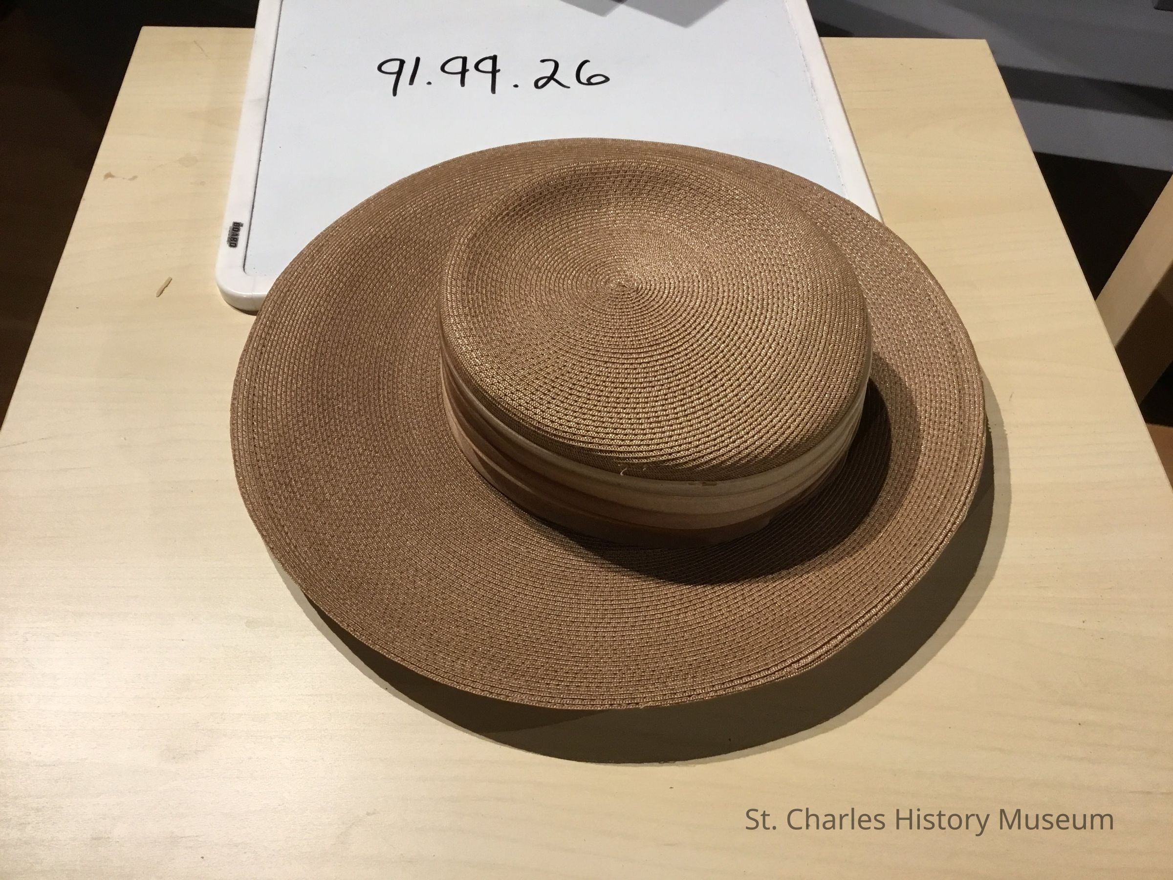 Light brown straw hat. Flat brim, narrow at back and wider at front. Variegated brown voile ribbon around crown. "Style by Juli-Kay, Chicago" tag inside. Worn by Elizabeth M. Howard on her trip to Europe, 1959.Lexicon