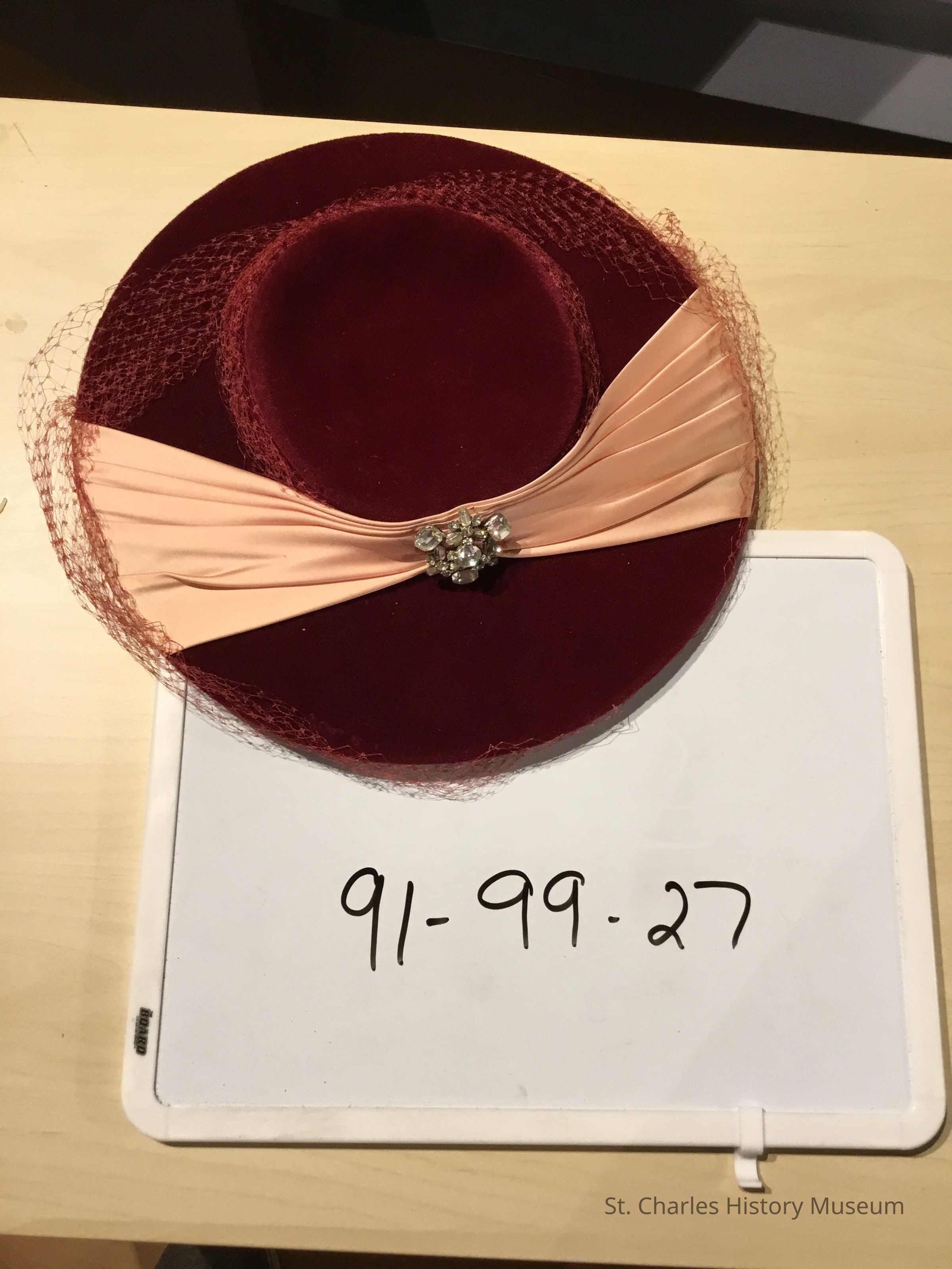 Dark red velour hat. Flat brim, narrower at back, wider in front. Pink satin ribbon stretched across top of hat and secured with a rhinestone pin. Dark red net around crown, sides, and front. Worn by Mrs. James Howard to wedding of her daughter on 11-12-54.Lexicon