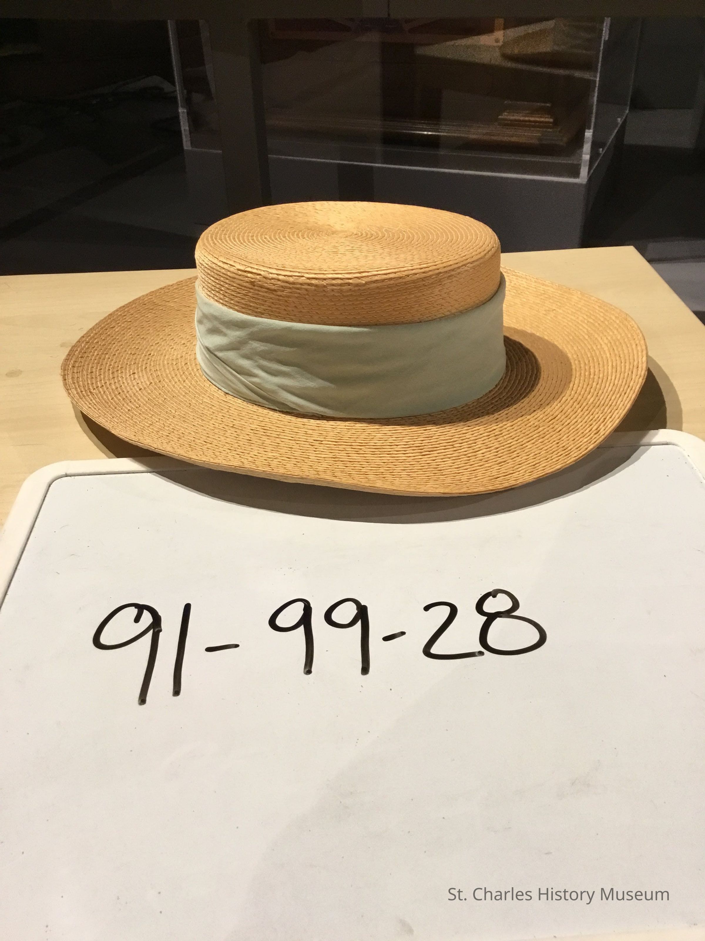 Natural colored straw hat. brim around hat. Light blue chiffon band around crown of hat. Band is attached over a ribbon around band. Red and white sticker on inside of hat. "Made in Italy." Hat bought by Elizabeth M. Howard in Venice, Italy. 1959.Lexicon