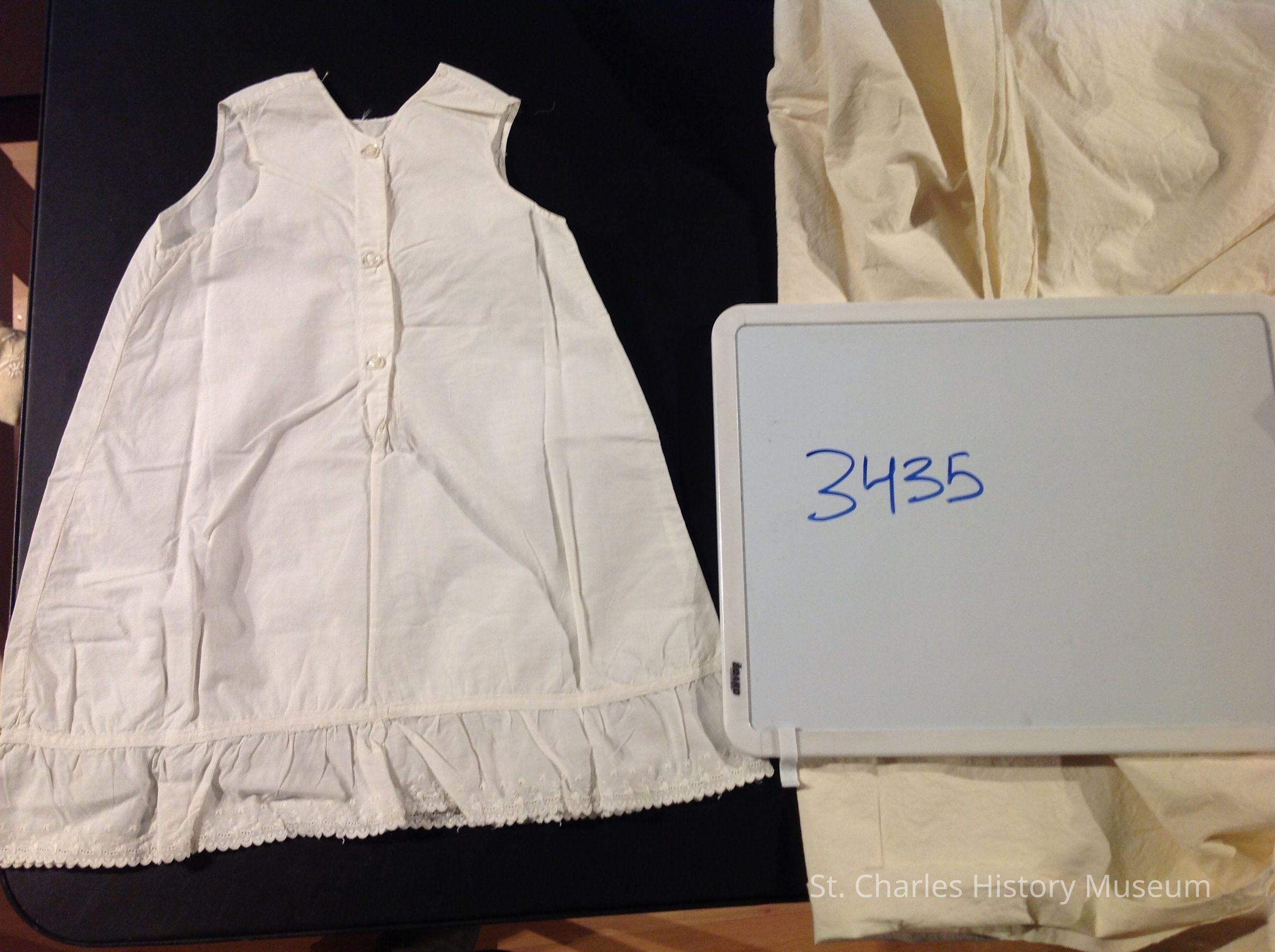 Baby slip, white, short, belonging to Robert Nelson. Sleeveless, eyelet ruffle along hem, 3 buttons down front. 19 1/4"L