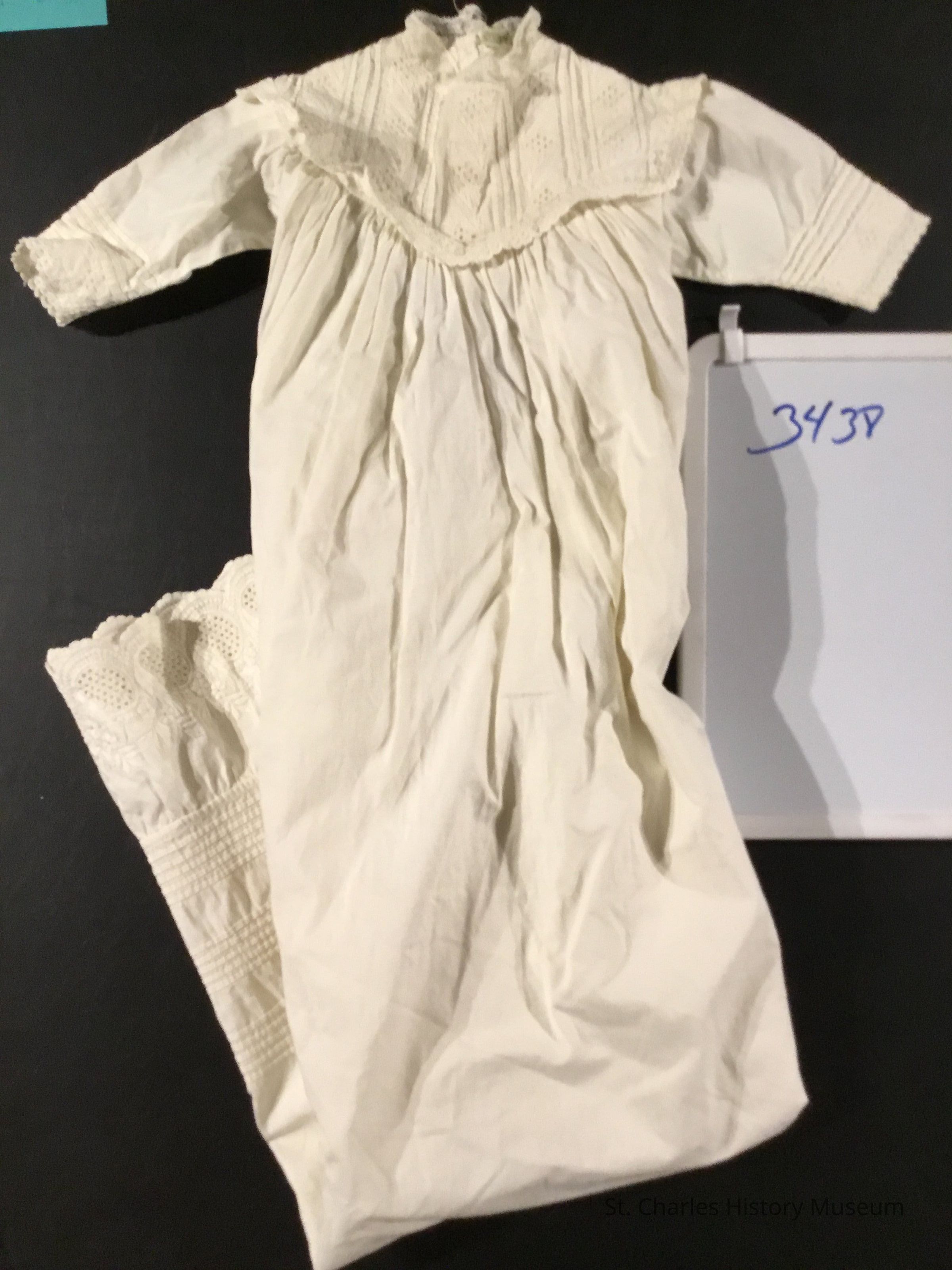 Baby dress, white with tucks, belonged to Robert Nelson, 42"L, white cotton, lace cuffs, bodice, collar, 3 rows of pleats around lower edge. Scalloped hem, 7 buttons on back. Condition: no damage.Lexicon