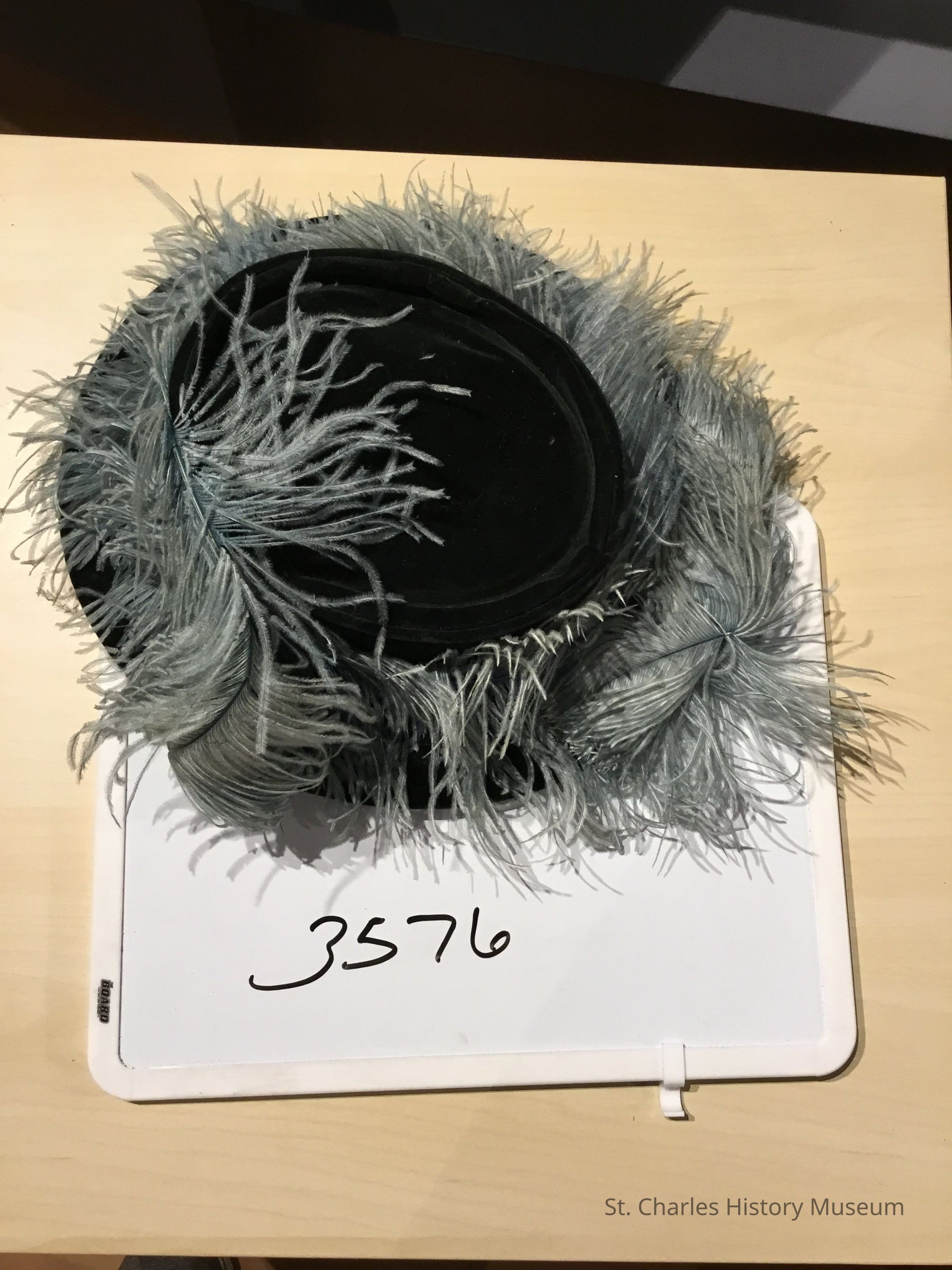 Beach sailor Hat with light blue feathers worn by Mrs. G.W. Terwilliger in the early 1900s. She was born in 1871 in New York, coming to St. Charles about 1890 and living here off and on until 1910 when she moved to South Dakota where she died in 1947 and is buried in Union Cemetery.