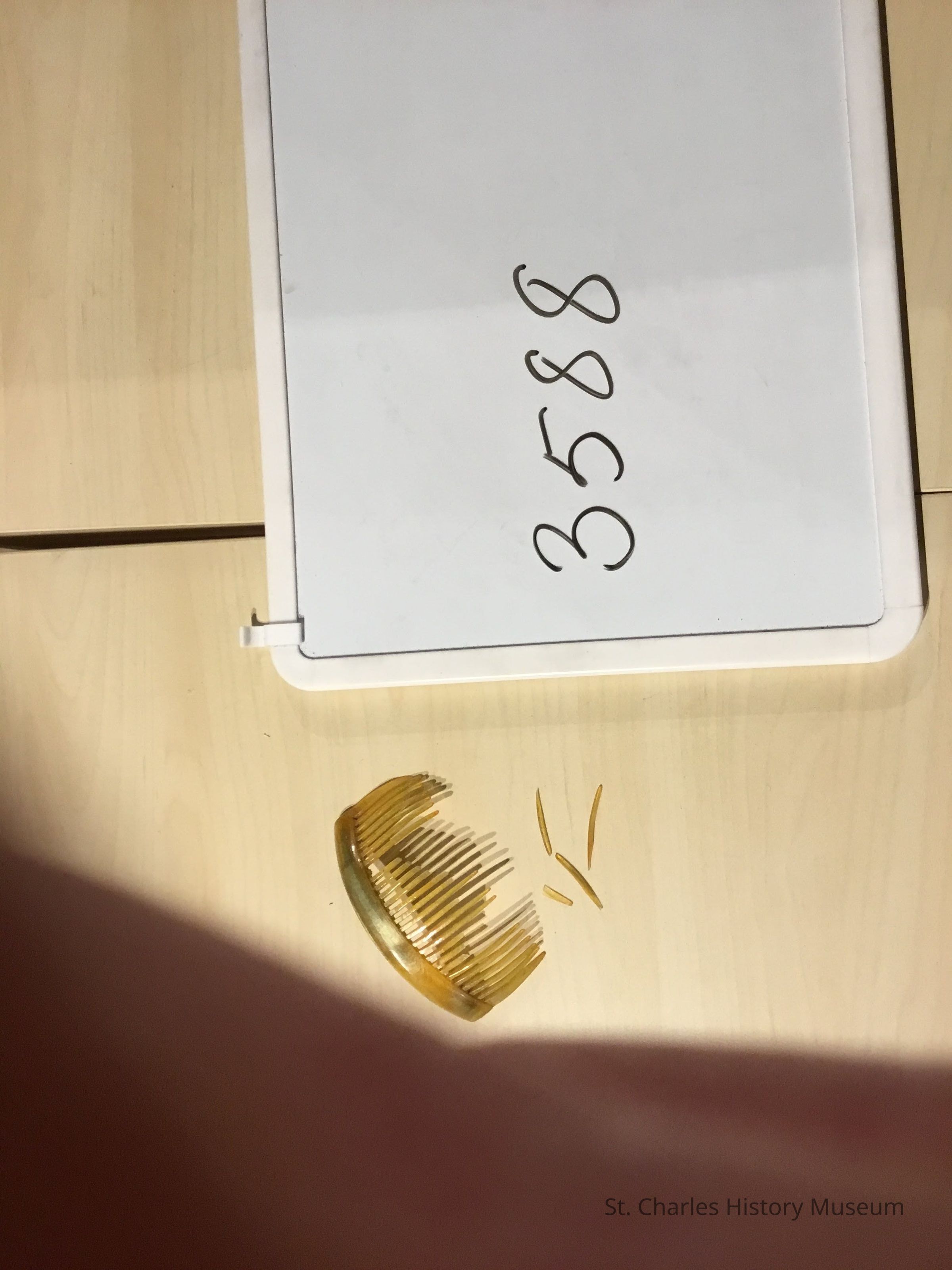 Hair comb, ladies hair comb, light tortoise shell color curved. Gold green across top edge, 2 1/8"h x 4 1/8"l. Dark yellow or light gold comb.