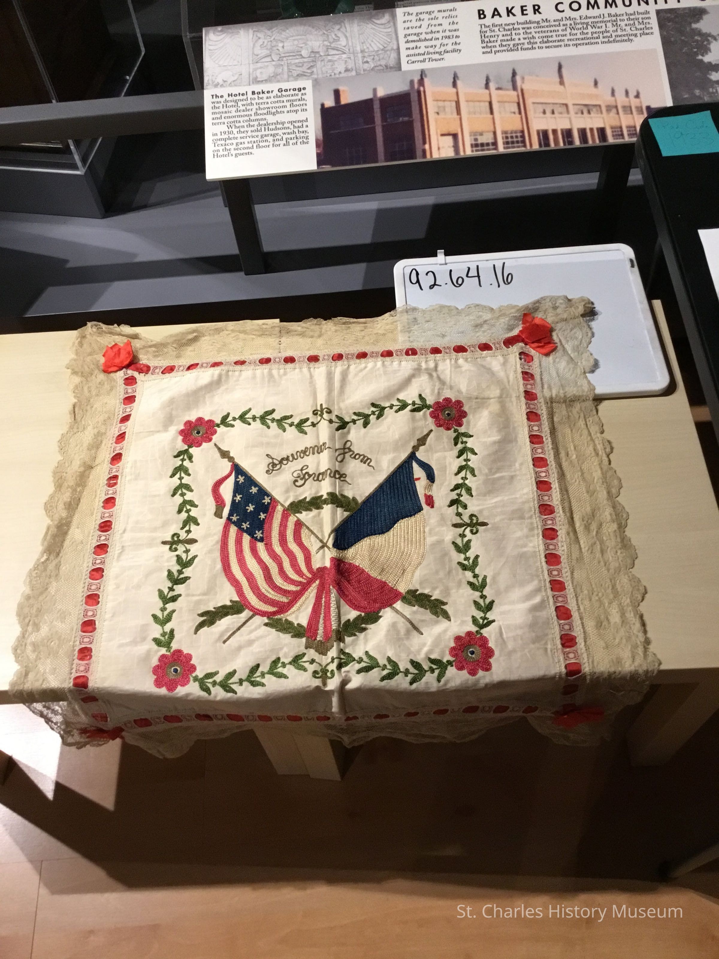 White satin cover, pink backing. WIde white lace. red satin ribbon woven through lace. Embroidered image on top. Red white and blue US and French flags surrounded by red flowers and green vines. Pink backing sewn on 3 sides. Sewn with gold thread on front "Souvenir from France".Created By