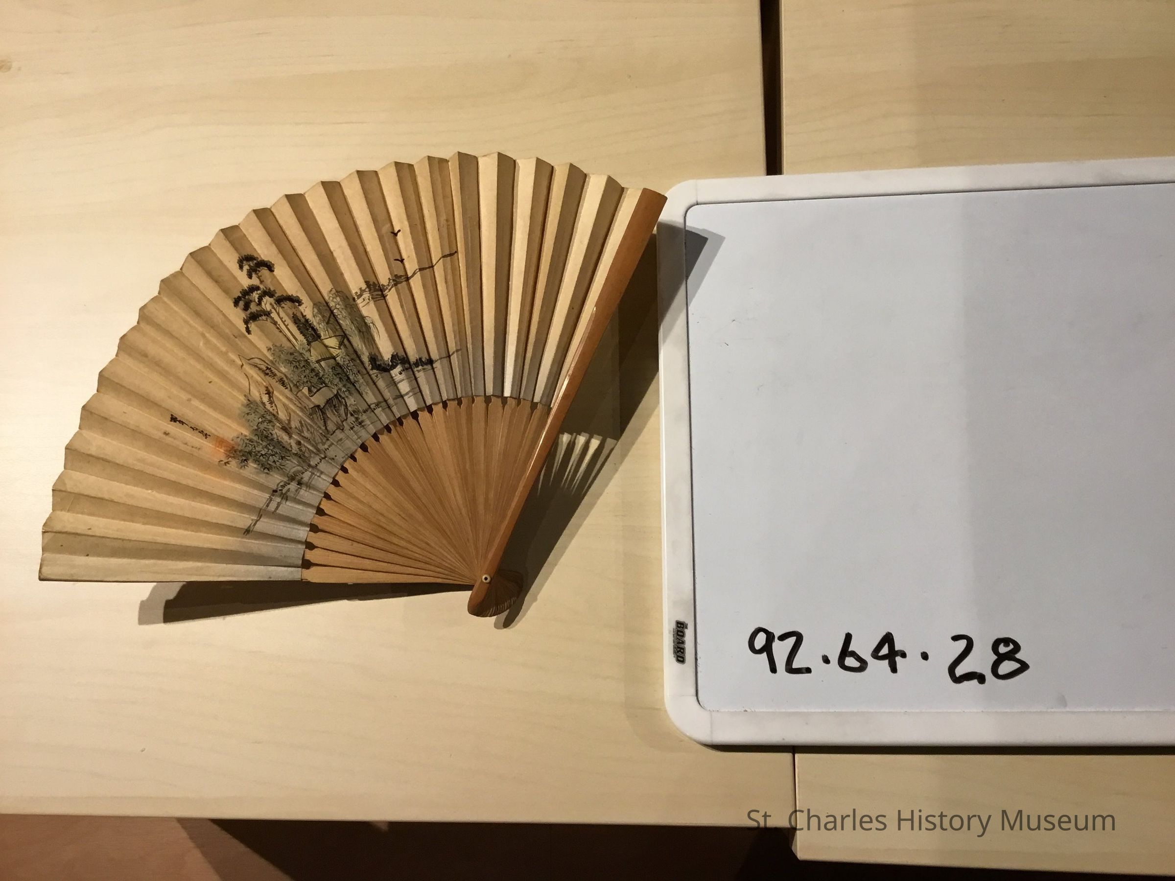Paper fan. painted scene of trees and rocks. Green, black, and yellow. Wood frame. Acquired by soldiers during WWII from Philipines.Created By