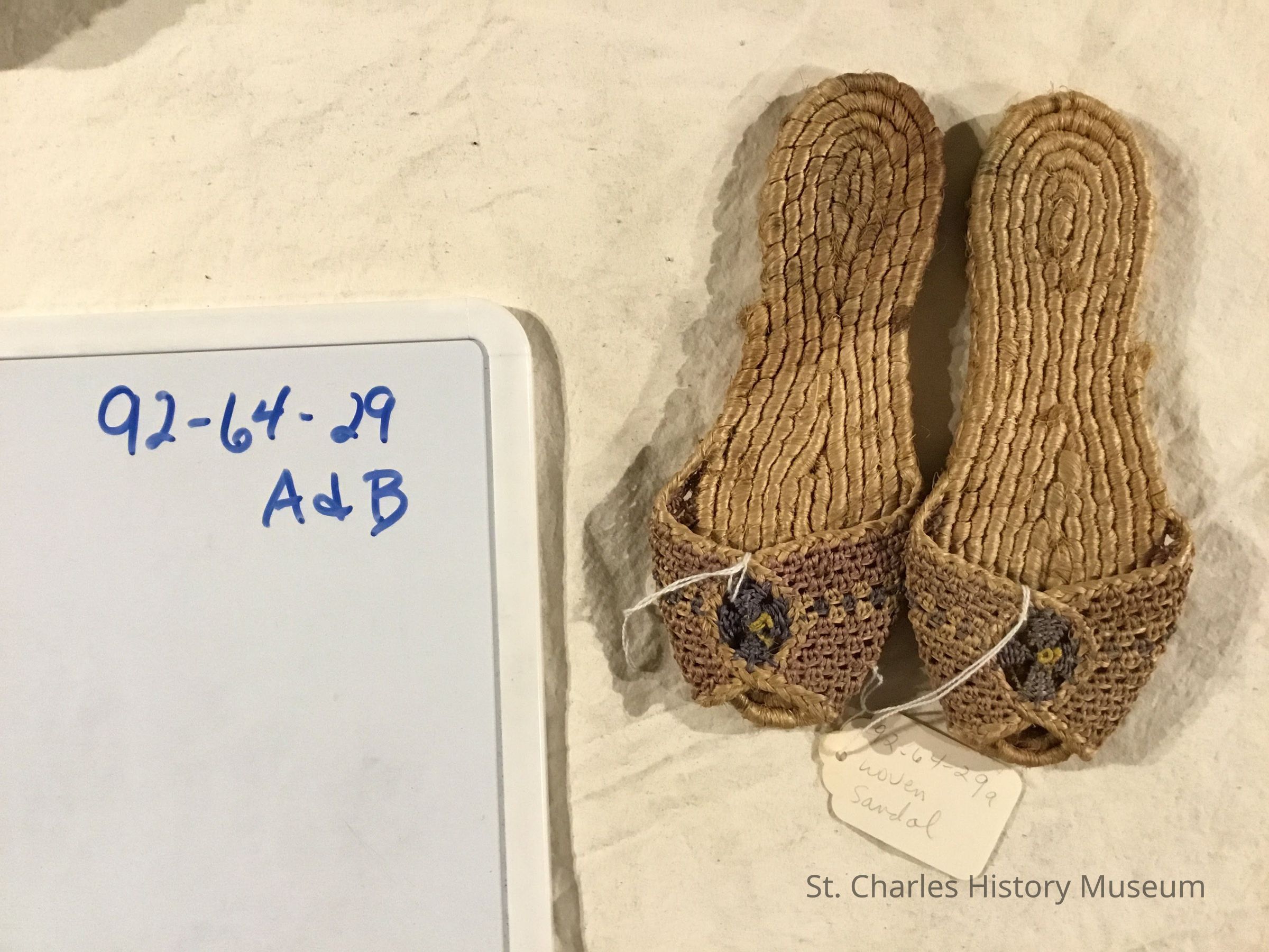 Woven sandal from course fiber. Purple, yellow, and blue fiber across top of sandal. Acquired from WWII soldier from Philipines.Lexicon