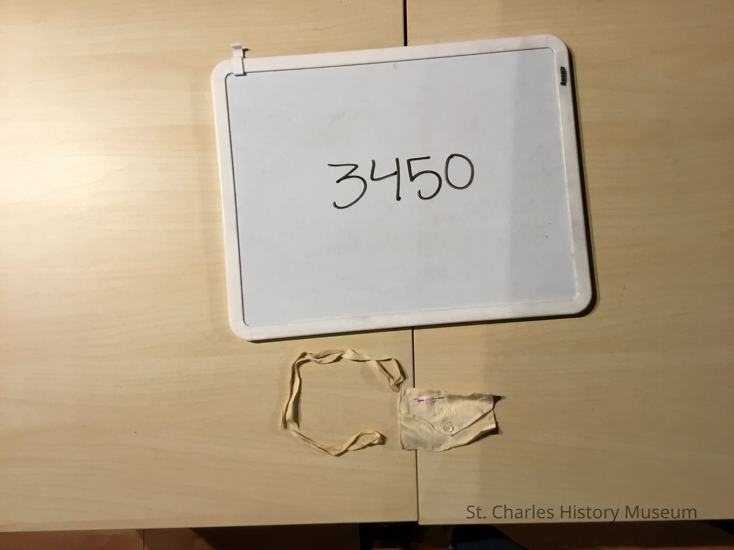 Coin purse white cloth with button "MML" embroidered on flap; this has a strap so the purse can be worn and hidden inside a bodice.