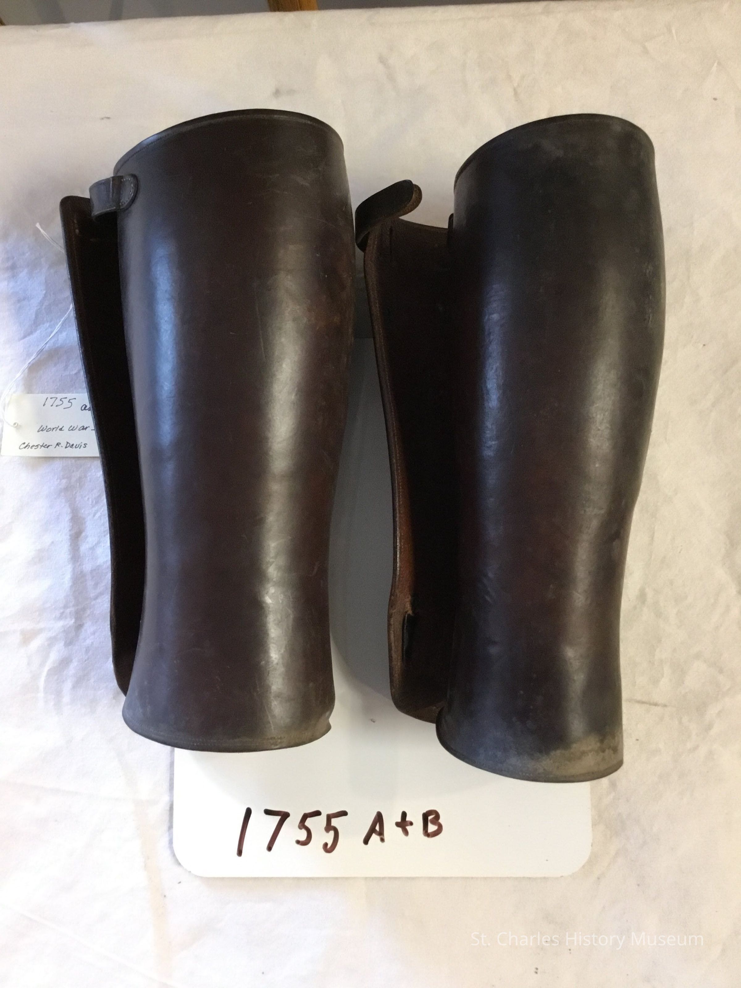 cd: a pair of hardened brown leather leg protectors. Held closed with strap and brass loops. No markings inside.