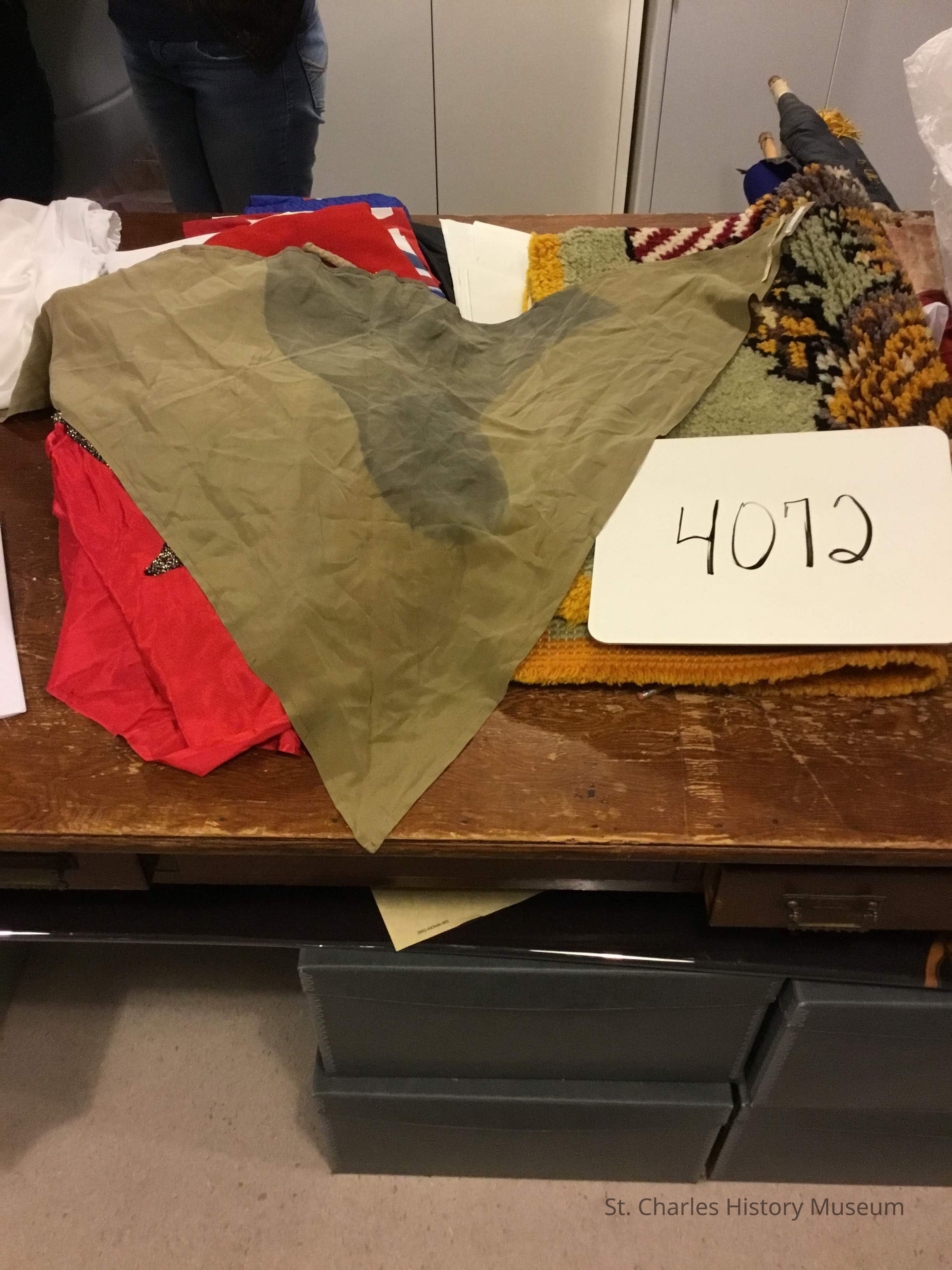 Approximately 36" three sided silk piece of German parachute grey-green World War II parachute. Brought back from Europe by Samuel S. Holmes, who had an air to ground radio group who had guarded Patton's flank all across into Germany.
