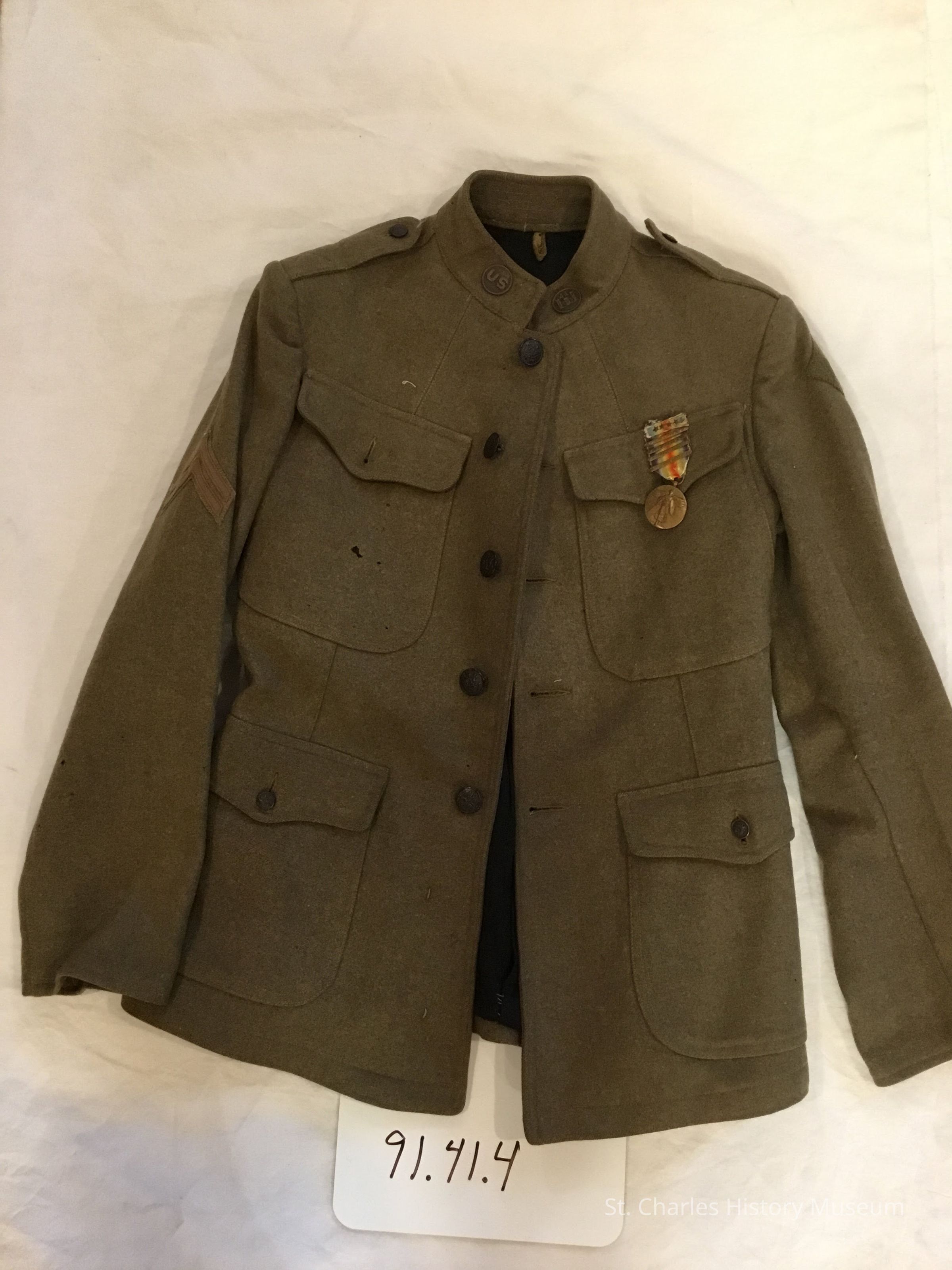 29"L 17" W Olive drab wool Model 1917 Service coat. Black cotton lining with maker's tag: Franklin Uniform Co, New York, contract date illegible, New York Depot QM. Four patch piockets, epaulets. Blackened bronze buttos impressed with American Eagle. Two collar disks: right US, Left, 4th army engineers. Left sleeve; top,4th infantry division. White green on olive grab diamond shape, two gold (tarnished) upside down chevrons (overseas stripes) denoting one year overseas service. Right sleeve: OD Corporal chevrons. Above left is World War I Victory Medal with four brronze battle stars denoting five awards of this medal. Gold bars on ribbon denoting 1.Aisle Marne, St. Michel. 3.Meuse Argonne 4. Defensive Sector. Multiple moth nicks overall. Franklin Uniform Co, New York. 91.41.4Collection
