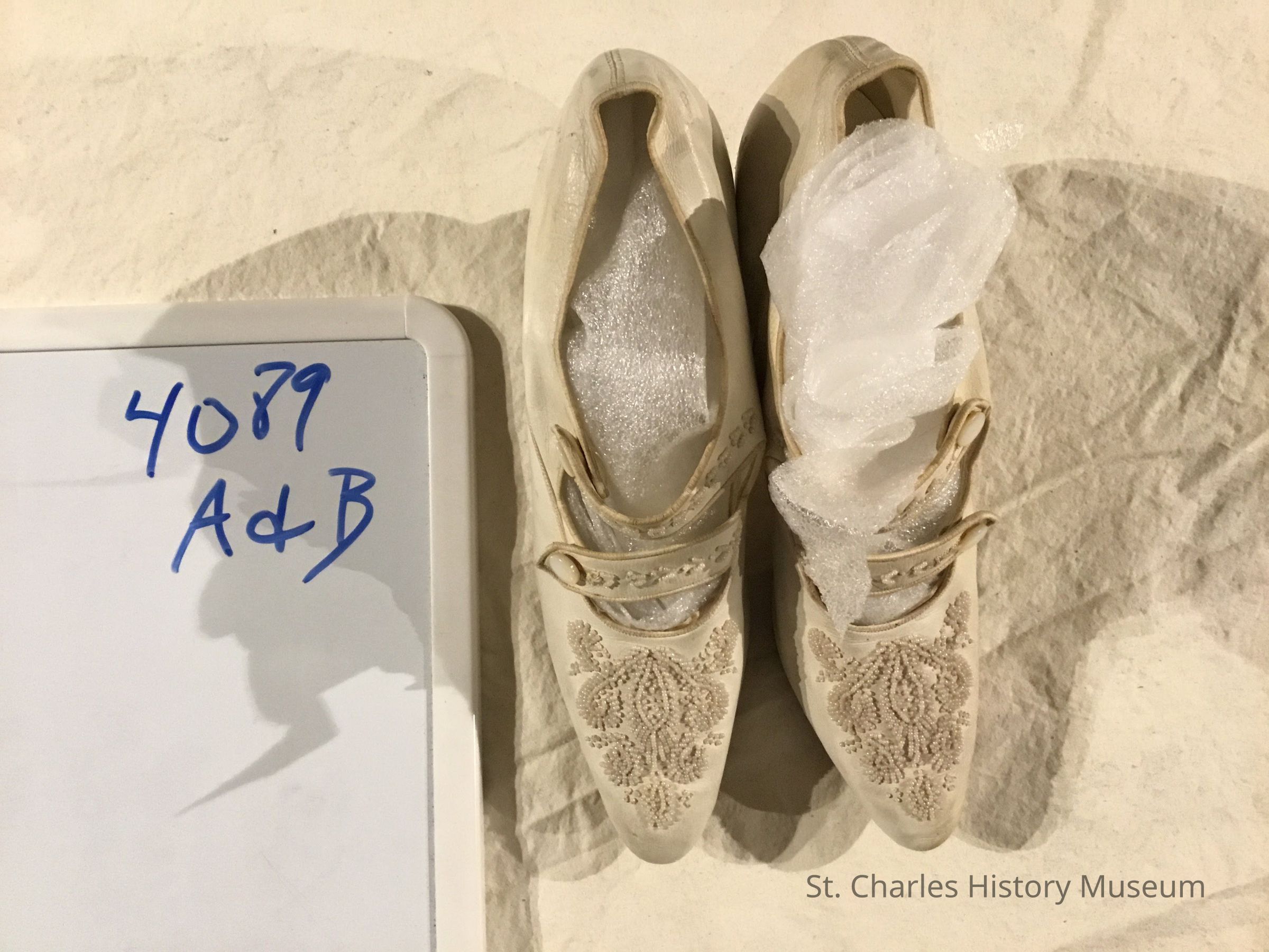 White beaded shoes; 2 white buttons; medium heel size 4-c - Marshall Field &Co., Chicago.