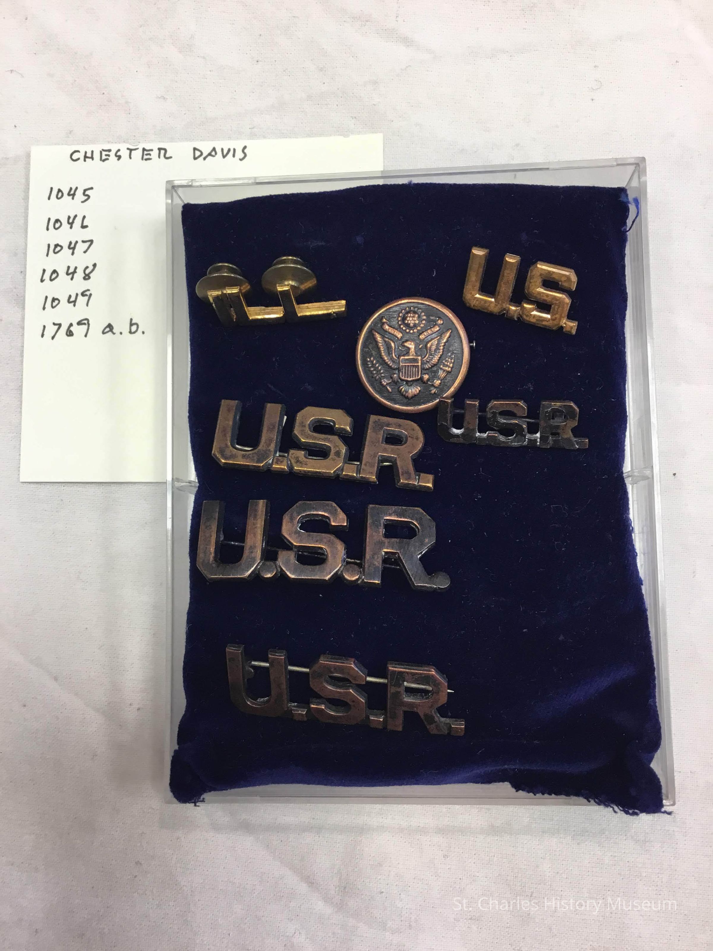 Army officer's lapel insignia "U.S.R." United States Reserve. Blackened Bronze rectangle with three cut out letters forming USR. Blackening wearing off, 1046Collection