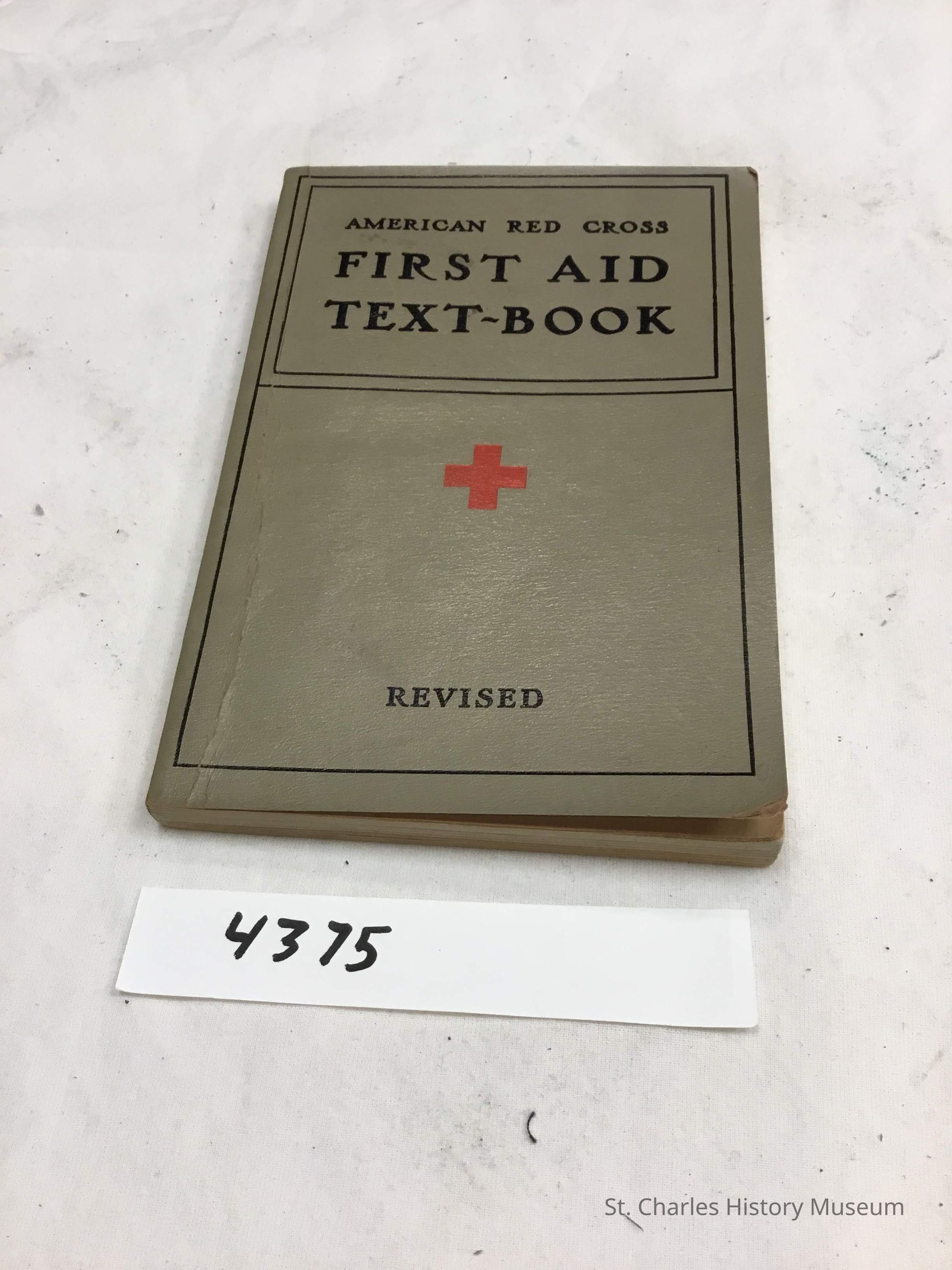 Paperbound "American Red Cross First Aid" textbook with black and red print on brown cover.