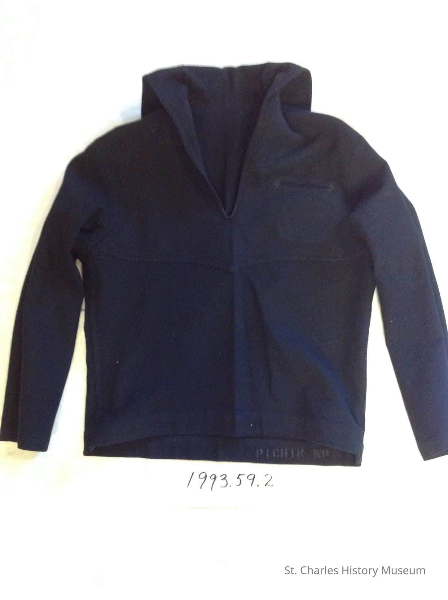 Dark blue wool blouse. V neck with black collar. Slit breast pocket. Long sleeves. "Pichik" stamped on underside lower hem and on back of blouse under collar. Tag sewn under collar. "Manufactured by Naval Clothing Factory".Created By