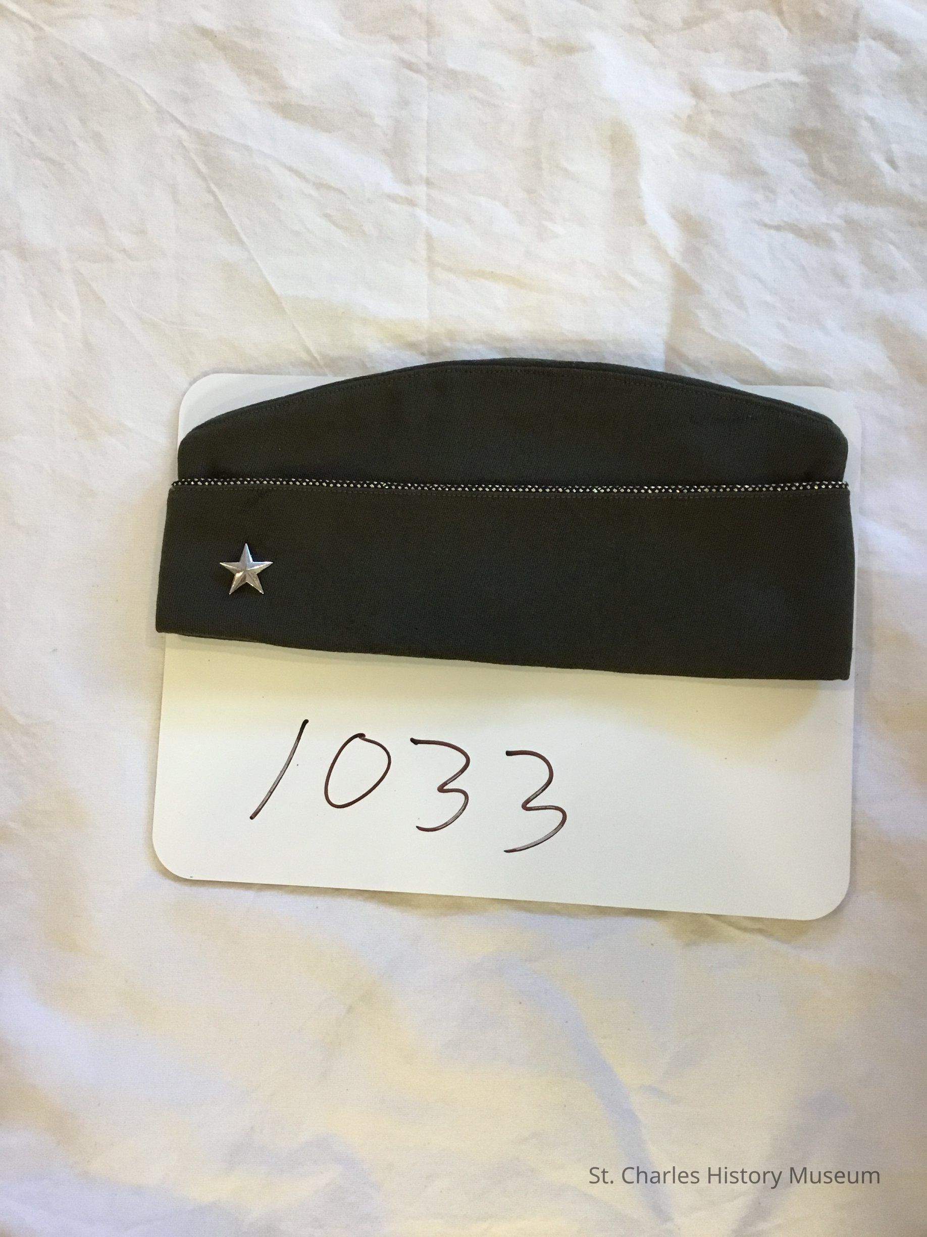 Dark green Army cap with gold band; silver star; size-7.5; all wool; label: Chicago Military Stores, World War I; gold braid trim,Lexicon