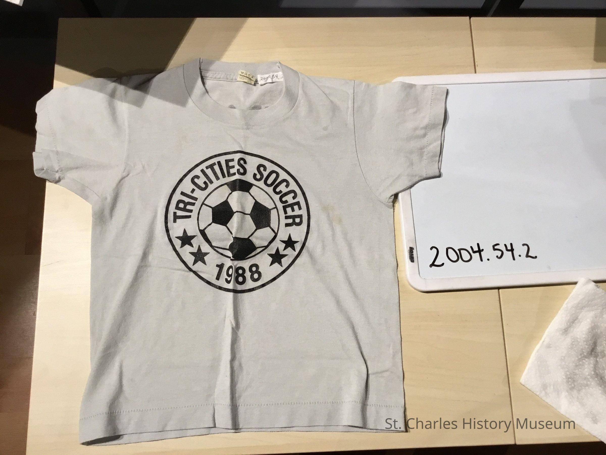 Child's Cotton T-Shirt, Gray color, printed on front of shirt is "Tri-Cities Soccer 1988" on the back od the shirt is "Silver Streak" and the number 5.