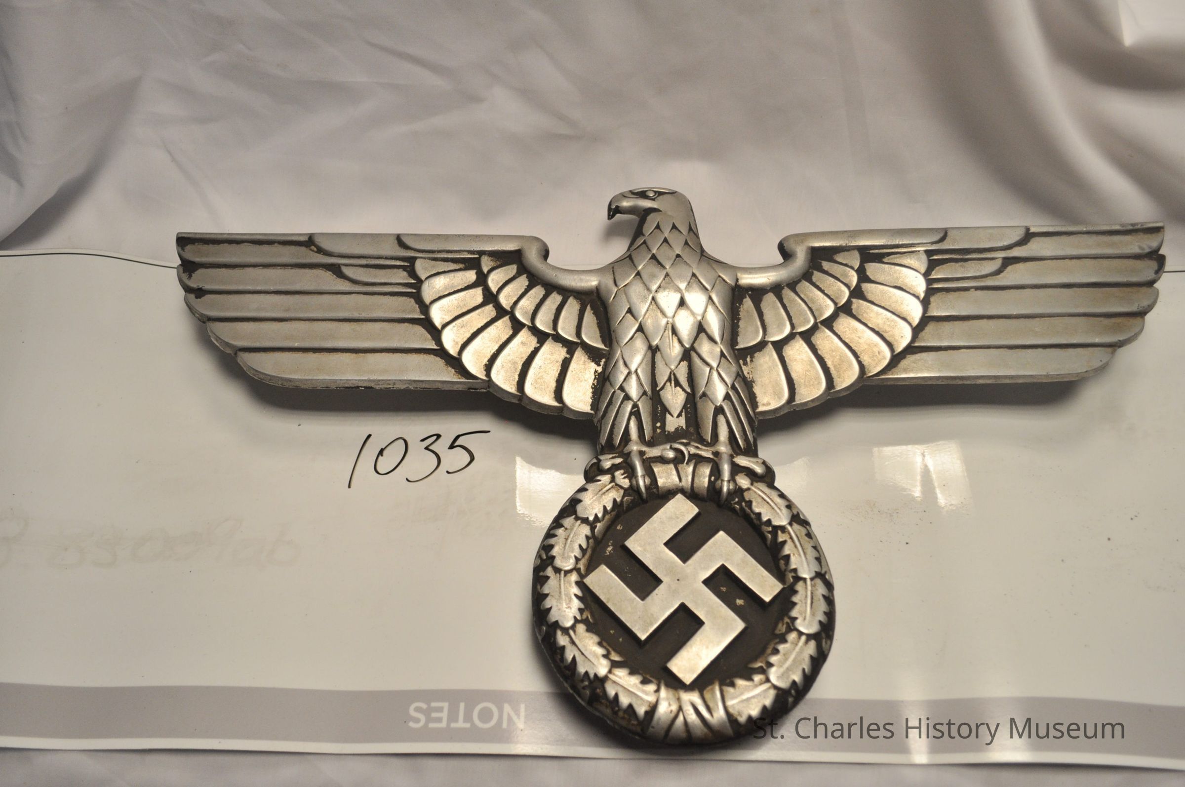 Silver medal; Eagle nesting on round swastica; 4 bolts on back. Marked on back: P/S LOK 600; GAL-MG Si; Also: OT, RZAS, BERl. Taken from balcony where Hitler made his speeches at Nurnberg by...the Americans.