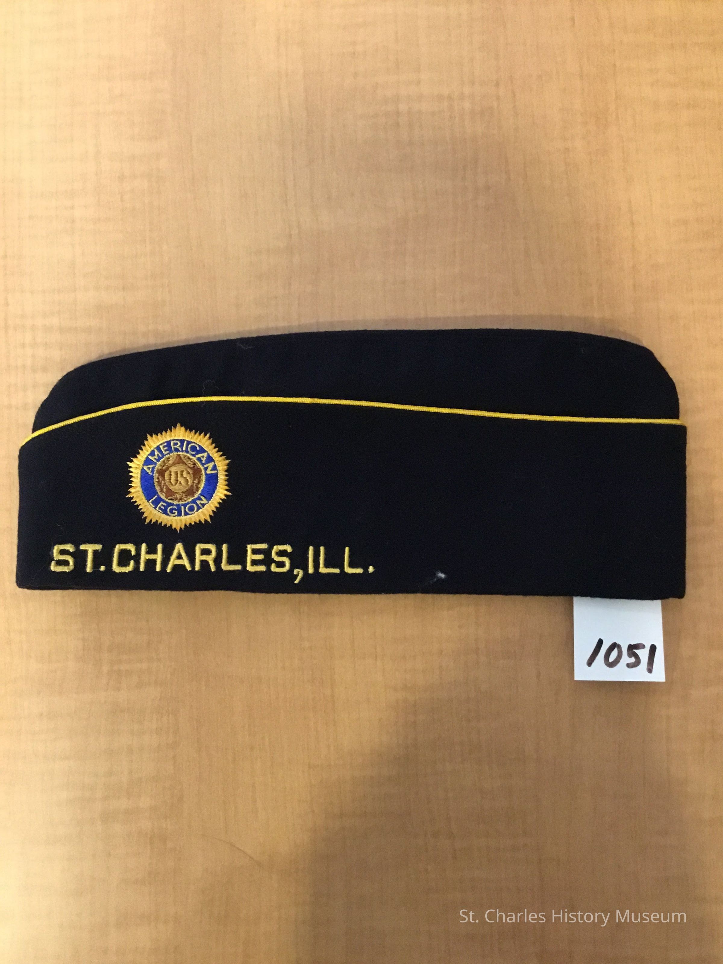 Navy wool cap with gold trim. Inscribed: American Legion; St. Charles, Illinois. Size 7 1/2, belonging to Chester Davis, who is the donor. Name is painted inside....gold silk lining:National Headquarters, The American Legion, Indianapolis, Indiana. 5" h. x 12" w.Lexicon