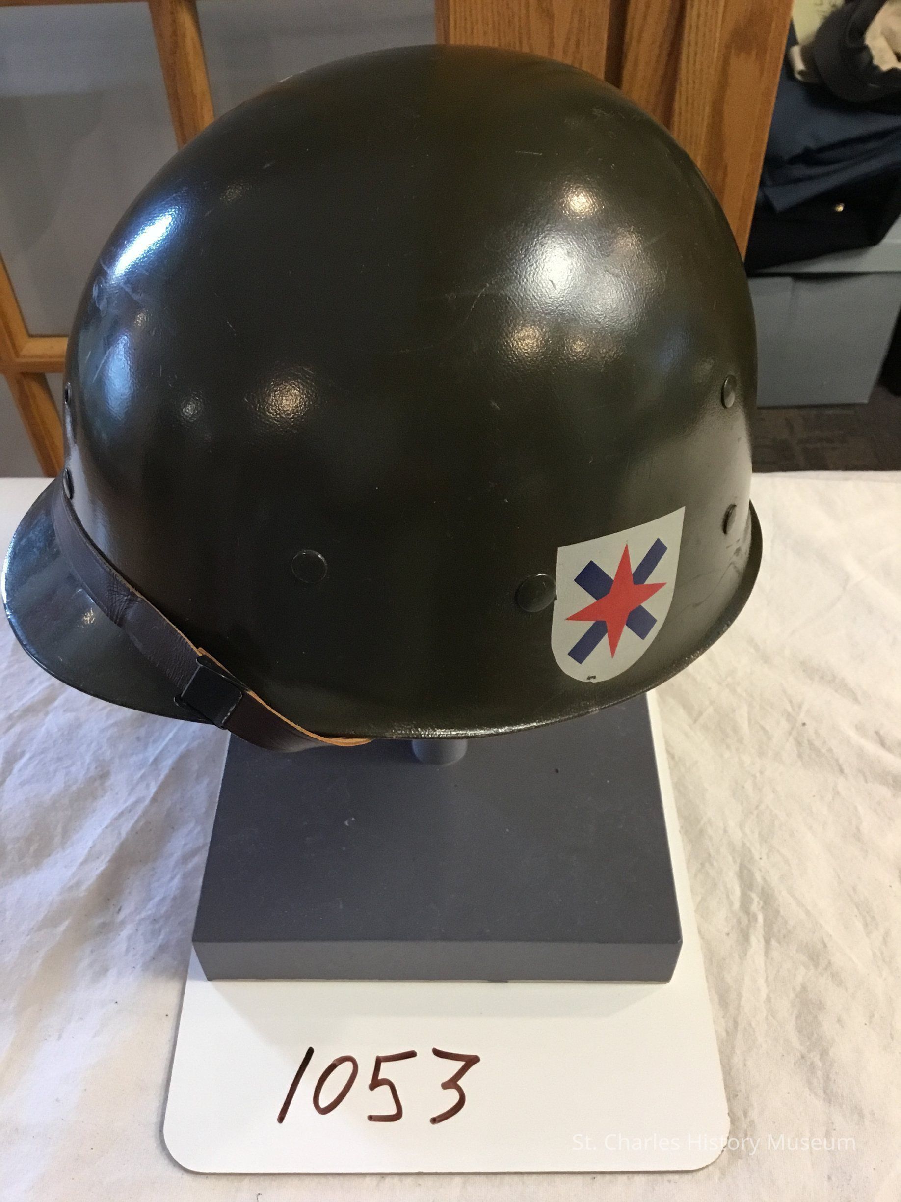 7" h. x 10 1/2" l. dark green U.S. Army helmet, with a plastic leather chin strap. Marked on the inside: MICARTA, 1952.Lexicon